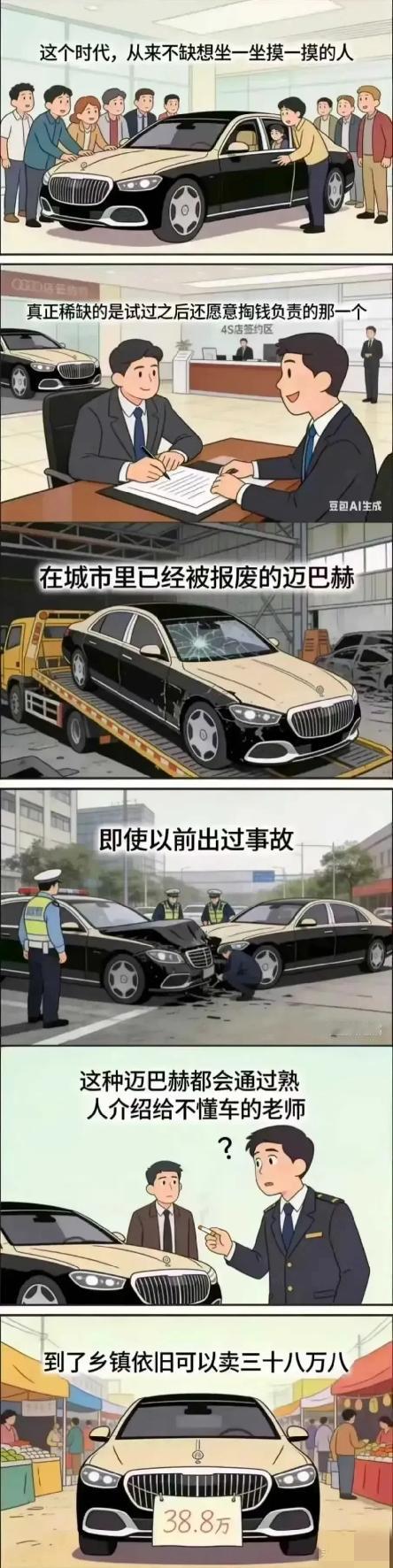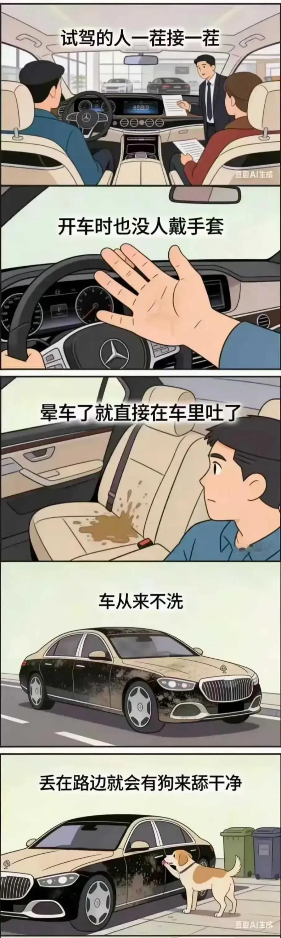 看到38.8万的时候,我终于明白这个漫画是在内涵某些人! 有人用豆包生了一组图,这个长图真是阴阳怪气的呢,内容是:“你在乡下看到的迈巴赫,其实可能是城里的网约车。这辆车看起来好像外表挺光鲜,但是被很多人用过。开车没人戴手套,跑了很多趟高速,甚至晕车的人还会吐。车从来也不刷,自有舔狗来舔干净;这种车只有临时牌照,也没过户;试驾的人很多,愿意掏钱负责的人没有。到最后,只有不懂行的人,出资38.8万买下它” 总感觉,语言怪怪的,意有所指却又无力反驳呢…… 你们品品,这到底在内涵啥?评论区说说看法~