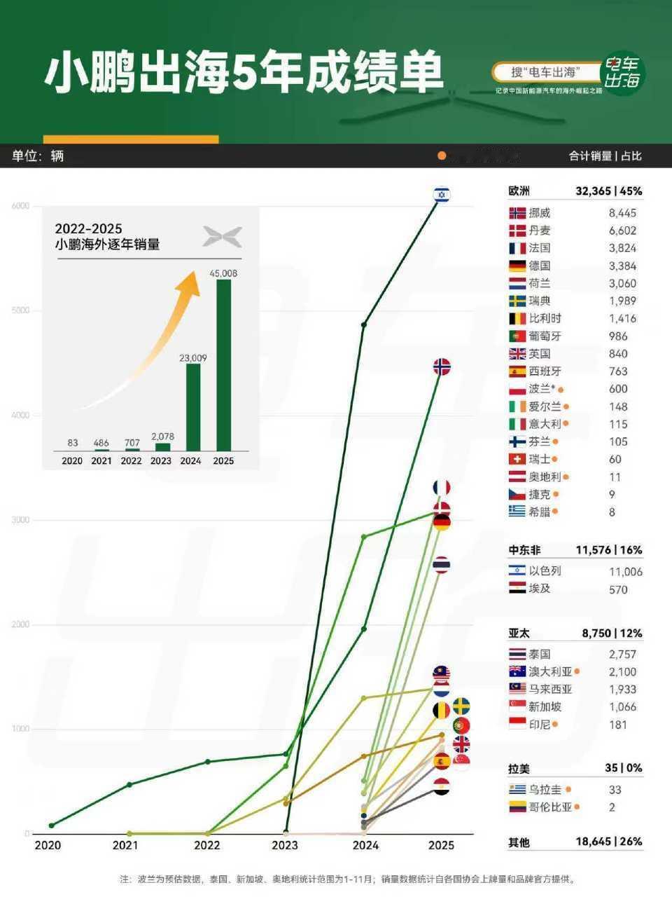 小鹏2025年的海外成绩单,有东西从统计的数据可以看到,小鹏去年海外卖了超过4.5万台,同比翻倍。这个量,在新势力里排第一,在自主品牌里排第二。这说明,小鹏自己那套出海“打法”,开始跑顺了。海外卖得好,全靠主力车型G6,去年在海外卖了将近2.1万台,同比涨了423%,贡献了接近一半的海外销量。X9在亚太作为纯电MPV,也能连续多月登顶,证明产品定位够准。更关键的是海外市场结构,有一半的量来自欧洲用户,G6能在荷兰、丹麦这些成熟的汽车市场拿下中国纯电销冠,足以说明产品是真的立住了。从2022到2025,小鹏用了五年的时间,在全球60多个国家和地区,开超过380家门店,特别是在埃及建成了中东非地区最大规模的专属服务中心,这明显不是为了短期卖车,而是想扎扎实实做好长期服务。所以,2025年像个转折点:小鹏出海不再只是“卖出去”,而是开始“扎下根”了。小鹏获新势力纯电出海第一2025海外纯电销量小鹏列自主品牌前二大V聊车