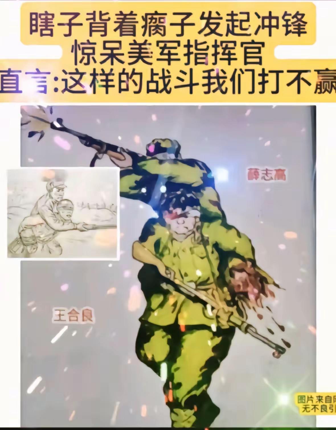 站在你面前的是令美军闻风丧胆的,上甘岭最强组合,一个瞎子背着一个瘸子,向美军阵地发起冲锋,前者冲锋,后者指路,惊呆美军指挥官!直言:这样的战斗我们打不赢。 谁是最可爱的人?这样的事迹不进教科书,天理不容!看哭了,中国胜利了,我们的英雄却不在了!我很少服人,这回五体投地了!王合良,薛志高,二位英雄爷爷,请收下我的膝盖,跪拜!中国军人,是打不垮,打不烂,打不服的军人。向所有的中国军人,致以诚挚,崇高的敬意! 你们想想,上甘岭那破地方,山都被炮弹炸平了,石头都成了粉末,美军的炮火密得能把天上的鸟都打下来。王合良眼睛瞎了,看不见路,只能凭着感觉往前冲;薛志高腿瘸了,站都站不稳,却还得趴在战友背上,一边忍着剧痛一边指路。这哪儿是冲锋啊,这简直是把自己的命豁出去,硬往鬼门关里闯! 换成现在的人,别说瞎眼瘸腿了,就算身上擦破点皮都得哼哼半天,受点委屈就哭爹喊娘。可这两位英雄,浑身是伤,连基本的行动都困难,心里想的却是怎么把敌人的阵地拿下来,怎么为战友们开辟生路。他们没有先进的装备,没有充足的弹药,甚至连一口热饭、一口干净水都喝不上,凭着的就是一股不服输的狠劲,一颗保家卫国的真心。 美军那时候多狂啊,武器比咱们先进十倍,兵源比咱们充足,后勤保障更是甩咱们几条街。他们以为凭着炮火就能把咱们的战士打怕,以为上甘岭随便就能拿下,可他们万万没想到,会遇到王合良、薛志高这样的硬骨头。看着一个瞎子背着一个瘸子,不要命似的冲过来,美军指挥官都懵了,他们这辈子都没见过这么不要命的军队,所以才会说出“这样的战斗我们打不赢”这句话。 这话一点不假,打仗拼的不光是武器装备,更是精气神。咱们的英雄们,把命都系在裤腰带上,把国家和人民的利益看得比什么都重,这样的军队怎么可能被打垮?可现在呢,好多年轻人整天捧着手机,追着那些娘里娘气的明星,对这些真正的英雄却知之甚少。甚至有人觉得这些英雄事迹是编的,觉得打仗哪有那么惨烈,真是让人寒心! 这样的事迹凭什么不进教科书?凭什么不让下一代知道,咱们现在的好日子是怎么来的?是王合良、薛志高这样的英雄,用瞎掉的眼睛、瘸掉的腿,用年轻的生命换来的!他们才是真正的偶像,才是值得我们一辈子尊敬、一辈子铭记的人。中国军人的骨头是硬的,精神是不朽的,这种打不垮、打不烂、打不服的劲头,就该一代代传下去。 各位读者你们怎么看?欢迎在评论区讨论。