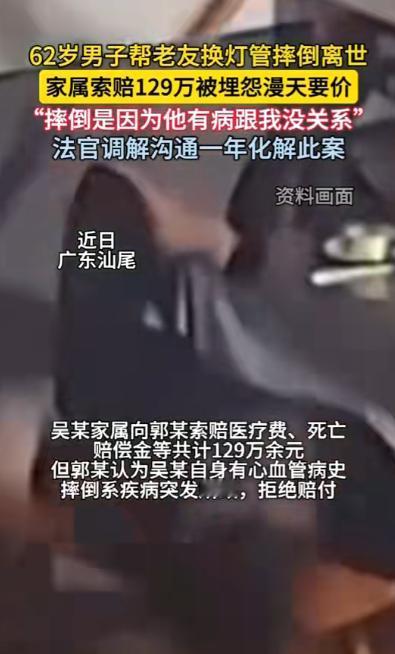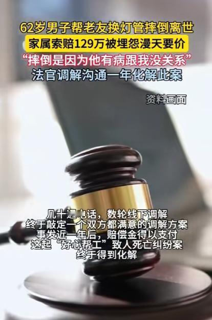 广东汕尾,62岁大爷被老友叫至家中帮忙更换吊灯灯管,谁知,他竟从梯子上重重摔下,头部着地,抢救无效后去世。大爷家属悲痛欲绝,将大爷火化并办理了后事,而后向对方索要各种赔偿129万余元。老友称其是自身心血管疾病引发,与他无关,家属就是漫天要价,拒绝赔付。双方闹上法庭。网友:凡事自己解决不了就花钱解决,不要求人,花钱踏实。 广东,郭某家的吊顶灯管突然不亮了,一把年纪的他看着客厅里的梯子犯了难,自己爬高总觉得不稳当,第一个想到的就是老友吴某。 两人住得不远,平时谁家有个小事小情,喊一声立马就到,郭某拨通吴某的电话,简单说了句灯管坏了想搭个手,吴某没半分犹豫,挂了电话就往郭家走,压根没提钱的事,在老辈人的观念里,这点忙是情分,谈钱就生分了。 到了郭家,郭某搬出家里的折叠梯,还特意站在旁边扶着梯身,生怕老友爬高时出点意外,吴某踩着梯子一步步往上挪。 眼看手就要够到坏掉的灯管,突然身子猛地一晃,整个人失去了重心,直直地从梯子上摔了下来,偏偏是头部先重重磕在了客厅的水泥地上,当场就没了动静。 郭某当时就吓傻了,手忙脚乱地摸出手机打 120,又扯着嗓子喊邻居过来帮忙,一路上他跟着救护车往医院赶,心里还盼着老友能挺过来,可医院的抢救室里,医生忙活了好几个小时,最终还是摇了摇头,吴某的颅脑损伤太严重,抢救无效离世了。 这个消息传到吴某家里,一家人瞬间陷入了崩溃,吴某是家里的顶梁柱,他这一走,整个家的天仿佛都塌了,沉浸在巨大悲痛中的家属,没来得及做专业的病理死因鉴定,就按照当地的习俗,匆匆将吴某的遗体火化,办完了所有后事。 悲伤过后,生活的现实摆在了眼前,家里的经济来源一下子断了,家属越想越觉得委屈,吴某是为了帮郭某干活才出的意外,这笔账理应由郭某来担。 随后他们仔细整理了一份索赔清单,把抢救时的医疗费、丧葬费、死亡赔偿金、被扶养人生活费等各项费用全都算了进去,一笔笔算下来,合计向郭某提出了 129 万余元的赔偿要求。 面对这笔巨额索赔,郭某的心里又痛又无奈,他对吴某的离世确实满心惋惜,甚至带着一丝愧疚,可让他拿出一百多万赔偿,他无论如何都接受不了,更觉得自己不该负这个全责。 他猜测老友是突发疾病才没稳住重心摔了下来,全程没人推搡,也没有外力影响,就是一场意外,怎么能把所有责任都算在他头上? 可吴某家属根本不认可这个说法,在他们看来,不管吴某有没有基础病,人是在郭某家、帮郭某干活的时候没的,郭某就必须负责到底。 双方各执一词,从最初的私下协商,吵到后来的面红耳赤,甚至闹到了当地的派出所,派出所的工作人员多次出面调解,试图让双方各退一步。 可家属坚持要全额赔偿,郭某则认为自己无错,只愿在情理上稍作补偿,谁都不肯退让,派出所的调解最终还是陷入了僵局。无奈之下,吴某家属将郭某告上了法庭。 考虑到案件的特殊性,法官采取了 “背靠背” 的调解方式,这之后的一年里,法官成了两家人之间的沟通桥梁,先后打了几十通电话,组织了数轮线下调解,在法理和情理之间反复权衡,一点点消弭着双方的分歧。 法官始终觉得,这起案件如果直接下判决书,双方大概率都不会服判,而且郭某年事已高,自身也有疾病,根本无力履行判决书确定的赔偿义务,最后只会导致案结事不了,矛盾反而会更深,执行也会成为难题。 而这类涉民生的案件,不仅要明断是非,更要考虑实际的履行情况和长远效果,让当事人能切实感受到公平正义。 事发近一年后,在法官的不懈努力下,双方终于放下了争执,达成了一致的调解方案,郭某愿意支付一笔双方都能接受的补偿款。 吴某家属也接受了这个结果,赔偿金顺利交到了家属手中,这场持续了一年的纠纷,终于画上了一个句号。 这起案件被传到网上后,也引发了网友的广泛热议,不少网友都感慨不已,有人说 “换个灯管请个专业师傅也就 50 块钱,犯得着求人吗?花点小钱,买个踏实”。 也有人说 “人情味儿固然珍贵,但有时候,一次看似平常的帮忙,可能就会酿成无法挽回的遗憾”。 而这起因 “帮忙” 引发的悲剧,也让更多人意识到,亲友之间的互相帮衬是珍贵的情分,但这份情分,也需要建立在安全和量力而行的基础上,否则一不小心,就可能让温情变成矛盾,让老友变成陌路。 对于这件事,您有什么想说的吗?欢迎评论区留言讨论。 信源:半岛晨报2026-01-21——《62岁男子帮老友换灯管摔倒离世家属索赔129万 被埋怨"漫天要价”》