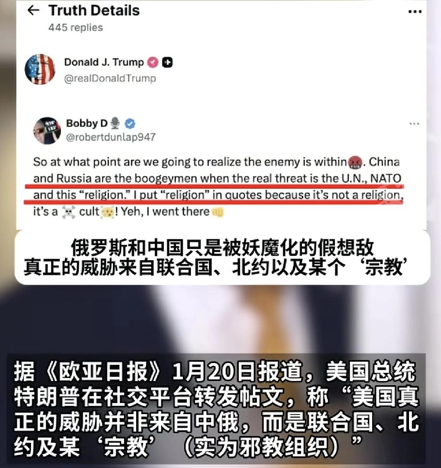 特朗普这是大声疾呼,打破旧秩序,迎接新未来,但东边两国似乎不感兴趣,特朗普就表示先吃个格陵兰岛打个样。 特兰普的种种表现可以证明,他的世界是一个大争之世,但现有秩序使得他没有用武之地,一个北约导致其被欧洲捆绑消费,如果没有北约,欧洲才是最好吃的肥肉,而45年建立的联合国,又有其他豪强对他监护,导致他缩手缩脚,所以他经常暗示另外两个豪强,世界很大,现在三国吃不完,但另外两个豪强有点跟不上特朗普天马行空的想法。
