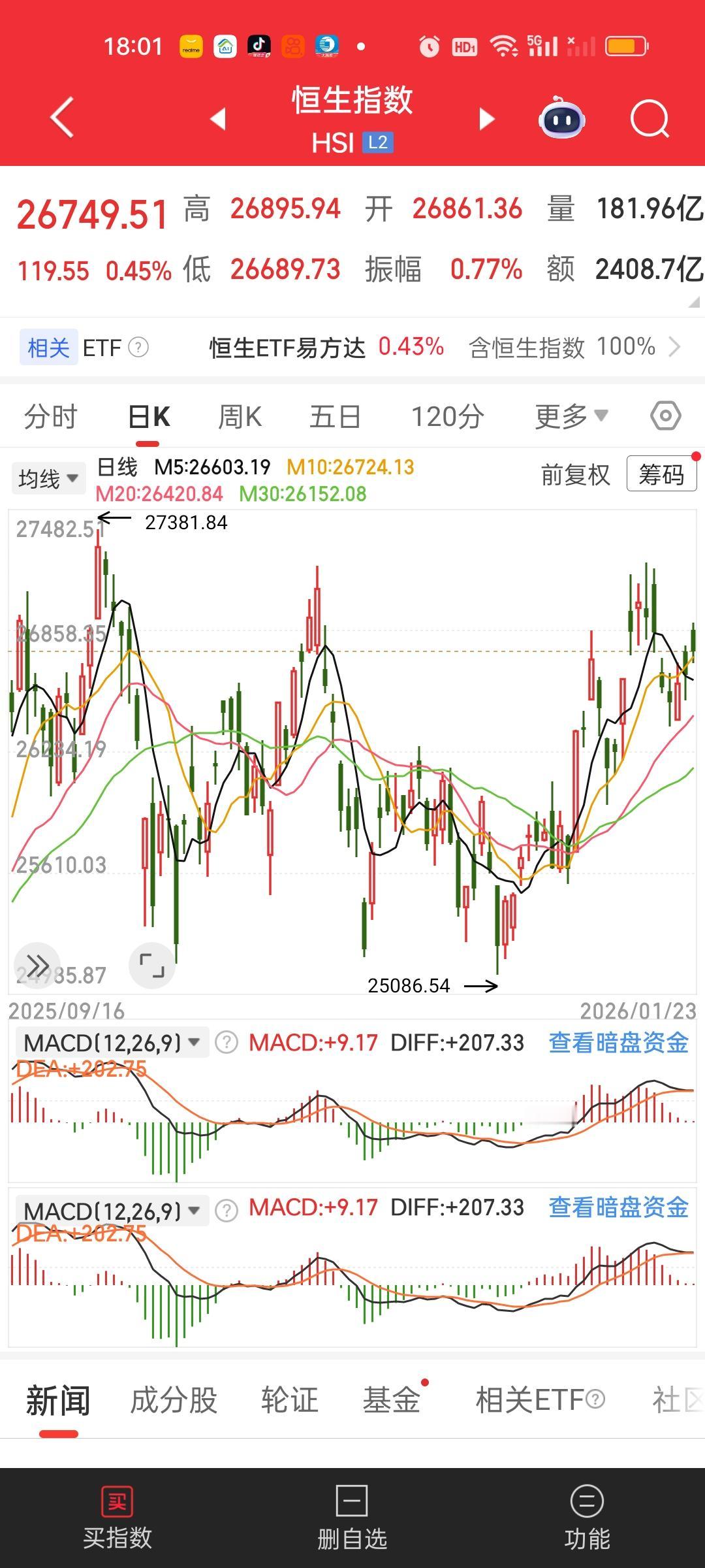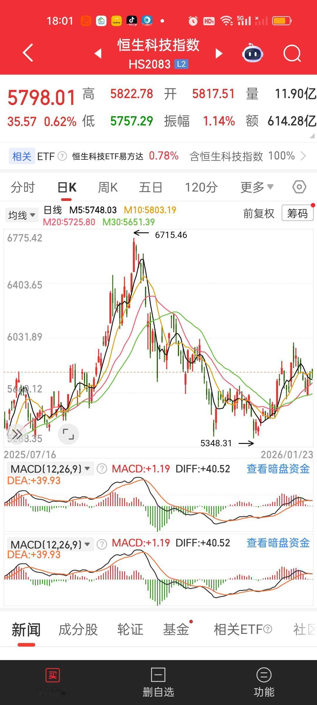 港股今天走的很平淡,恒指收盘收在了全部支撑之上。恒科还是和昨天一样,收在了5日20日30日线上方,收在10日线下方。恒科这个位置上升趋势并没有走坏啊。所以不需要太惊慌。但港股同时受到我们和老M的影响。短期内未必会产生大的行情。