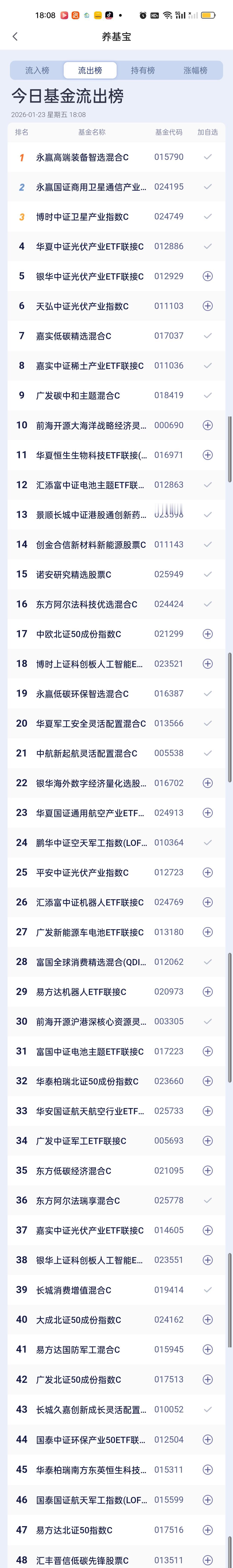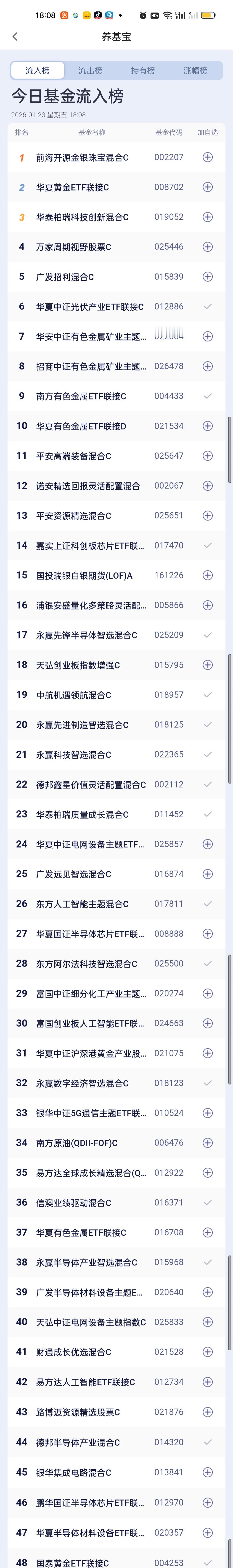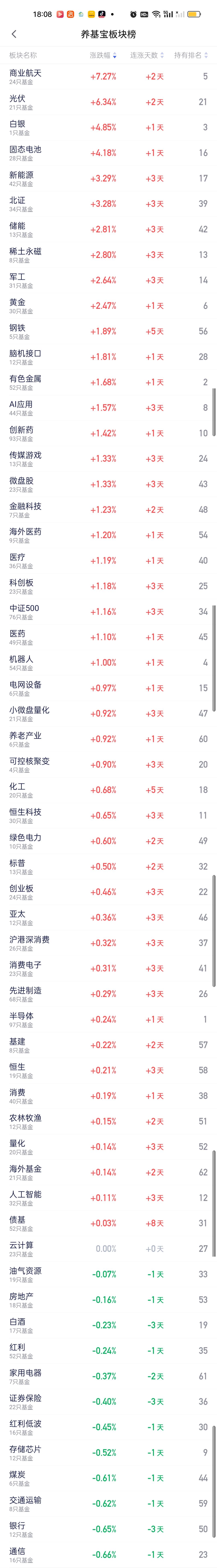 今日基金加仓榜,减仓榜,板块榜以及估值榜已全部更新完毕。加仓榜前三名是前海开源金银珠宝,华夏黄金ETF联接,华泰柏瑞科技创新。减仓榜前三名是永赢高端装备智选,永赢国证通用卫星,博时中证卫星产业指数。毕竟它们预估都涨了8.50%以上,大家选择减一下仓位也是很合理的操作。 板块方面,今天涨幅靠前的是商业航天,光伏,白银,固态电池,新能源,北证,储能,稀土永磁,军工,黄金。跌幅靠前的是CPO,双创50,大科技,通信,银行,交通运输,煤炭,存储芯片,红利低波,证券保险。