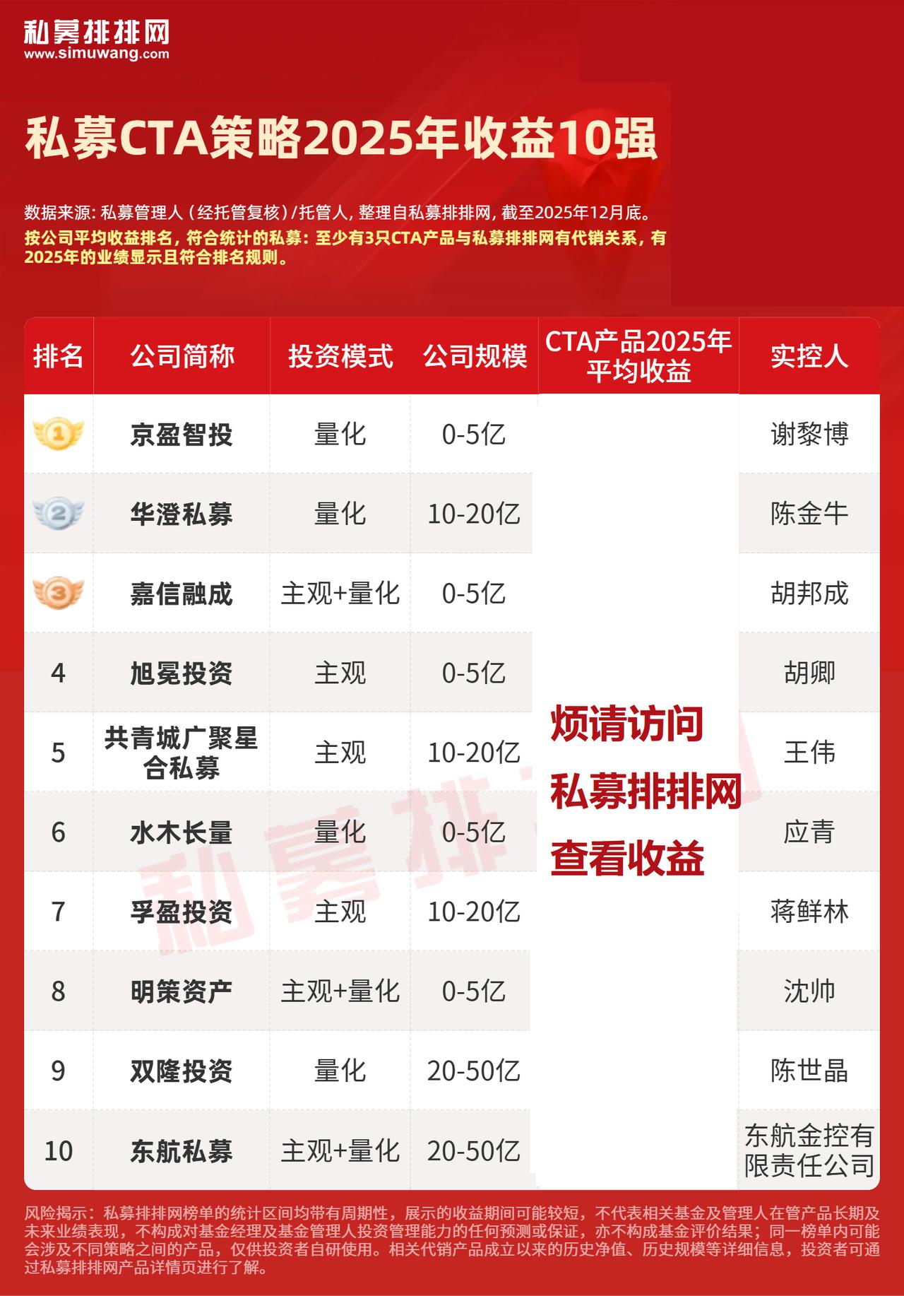 CTA策略私募基金公司排名前十(2025年度) 点击查看CTA私募业绩: CTA策略私募基金是以CTA策略为核心投资逻辑的私募证券投资基金,这类基金的投资标的与传统私募产品有明显区别,主要聚焦期货、期权等金融衍生品,覆盖范围既包括原油、黄金、农产品等大宗商品衍生品,也涵盖股指期货、国债期货等金融期货品类,并不局限于股票、债券这类传统投资资产。 其获利逻辑是通过量化模型搭建或主观市场分析,捕捉标的资产的价格趋势变化和波动率波动机会,支持双向交易操作,既可以做多价格处于上涨趋势的品种,也能做空价格进入下跌通道的品种。 1、京盈智投 公司实控人为谢黎博,公司规模在0-5亿之间,投资模式为量化。谢黎博作为公司核心投研负责人,深耕量化CTA策略领域。 京盈智投2025年9月在路演中表示,我们认为CTA策略这一轮仍处于比较前期的阶段,未来的上涨空间非常可观。2010-2019年的十年间,CTA策略平均收益良好。同时,国内期货市场品种丰富度超过欧美市场,加上新兴市场的波动性较大,为CTA策略提供了更多的交易机会。 2、华澄私募 公司实控人为陈金牛,公司规模在10-20亿之间,投资模式为量化。陈金牛主导公司量化CTA投研体系,通过高频因子挖掘与市场风格动态适配。 3、嘉信融成 公司实控人为胡邦成,公司规模在0-5亿之间,投资模式为主观+量化。胡邦成采用主观与量化结合的CTA策略,通过宏观周期研判与量化模型优化。 4、旭冕投资 公司实控人为胡卿,公司规模在0-5亿之间,投资模式为主观。胡卿以主观CTA策略为核心,擅长商品期货基本面研究与趋势捕捉。 5、共青城广聚星合私募 公司实控人为王伟,公司规模在10-20亿之间,投资模式为主观。王伟专注主观CTA策略,聚焦大宗商品产业链的供需变化,通过深度产业研究挖掘投资机会。 6、水木长量 公司实控人为应青,公司规模在0-5亿之间,投资模式为量化。应青以量化CTA策略为主,依托多因子选股模型与衍生品对冲工具。 7、孚盈投资 公司实控人为蒋鲜林,公司规模在10-20亿之间,投资模式为主观。蒋鲜林采用主观CTA策略,擅长商品期货的趋势跟踪与套利交易,通过动态调整组合结构。