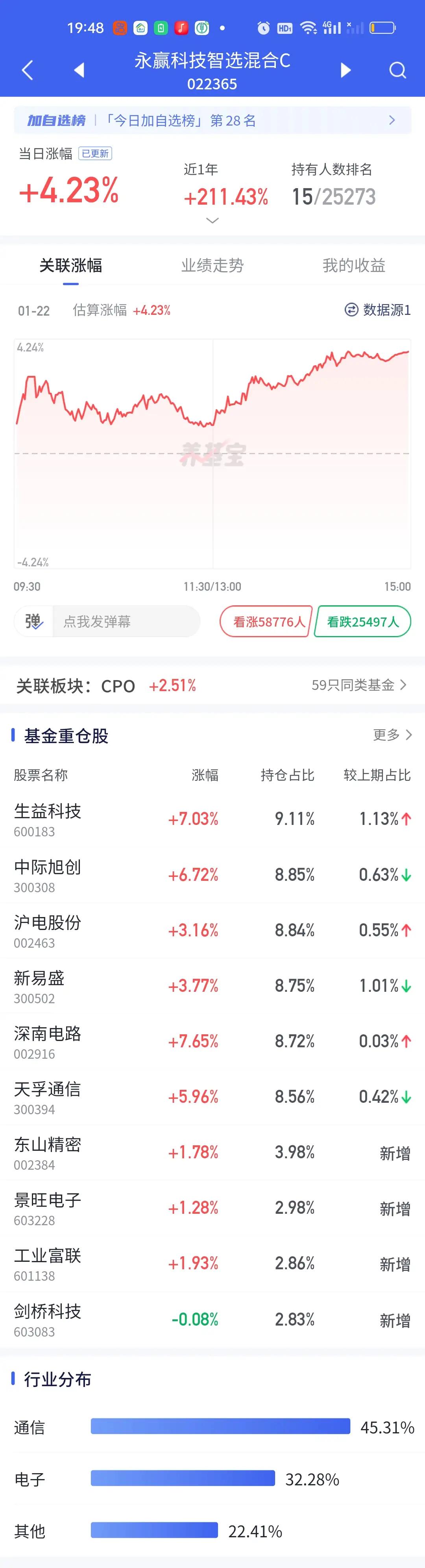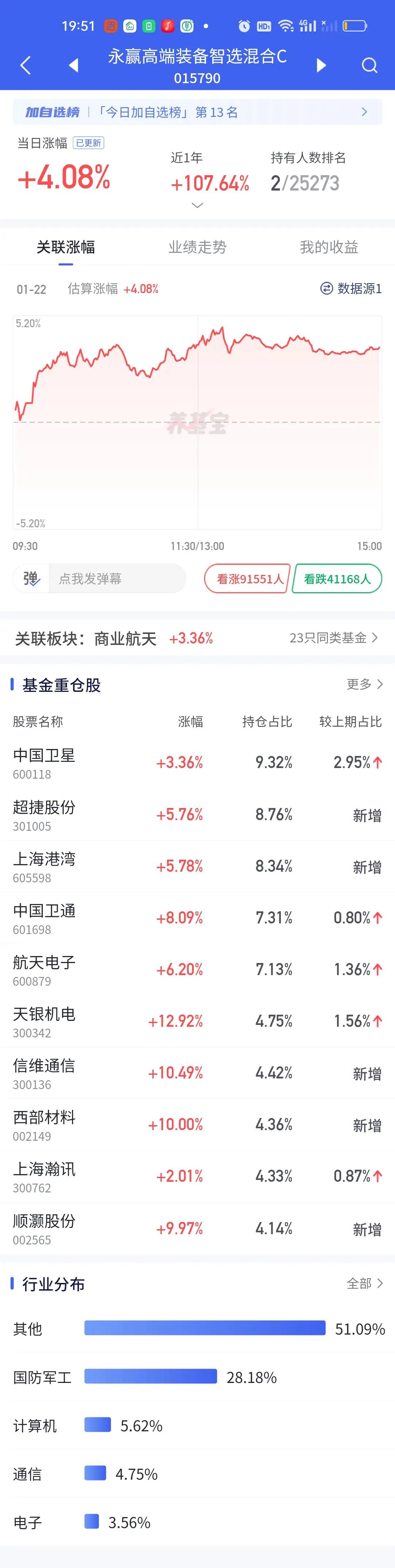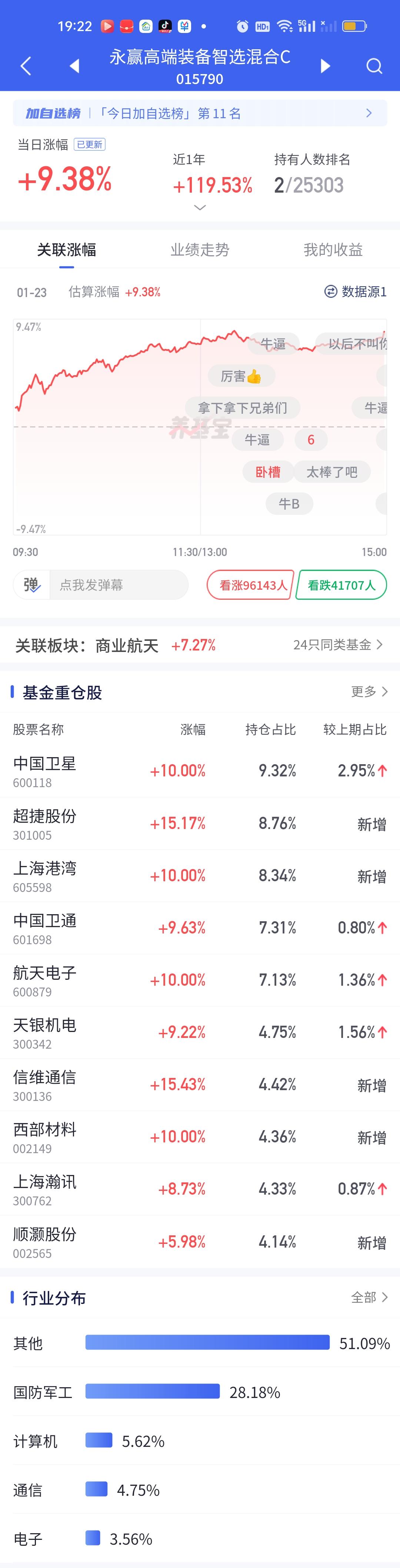 永赢的基金优不优秀,靠不靠谱我想持有它的人是最有话语权的!高端装备这次调仓新增的5只个股我是越看觉得靠谱。昨天大涨,5只有3只涨了10%,今天更加疯狂,5只有2只涨了15%,2只涨了10%,最差的那只也涨了6%。但昨天大涨的永赢科技今天大跌了,算是把昨天涨的那部分全还回去了,今天有人做高低切吗?永赢高端装备转永赢科技智选的。