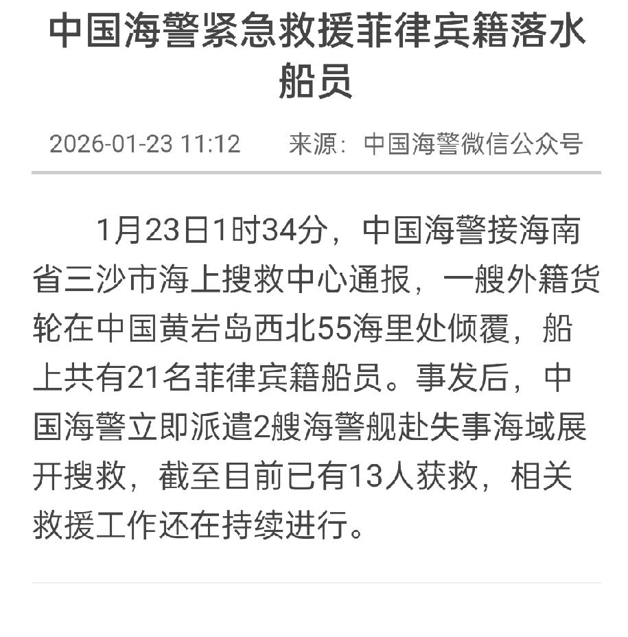 【中国海警深夜出动,黄岩岛救起13名菲律宾船员!】今天凌晨1时34分,中国海警接到海南省三沙市海上搜救中心紧急通报:一艘外籍货轮在黄岩岛西北55海里处倾覆,21名菲律宾籍船员落水。海警立即派遣2艘舰艇冲向事发海域,在夜色和波涛中展开搜救。截至目前,已有13人获救,救援仍在全力进行。 这次行动发生在南海要冲,距离海南不远。咱们华南老乡,尤其是常在海边生活的兄弟,都懂海洋的脾气——风浪无情,但中国海警始终是那道坚实的防线。他们不仅守护蓝海权益,更在危难时刻挺身而出,展现的是大国担当和人道精神。 救援还在继续,请一起为海警官兵加油! 您身边有亲友经历过海上救援吗?对中国海警的这次行动,您最想说什么?(图源:截图中国海警)中国海警紧急救援 华南关注 海南身边 致敬中国海警
