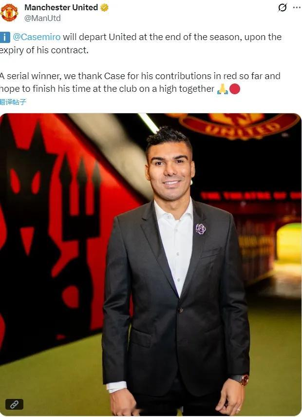 足球转会新闻 官方:曼联宣布33岁的卡塞米罗将在本赛季结束合同到期后离队。卡塞米罗在曼联效力了4个赛季(算上本赛季),至今出战146场比赛,打进21球,巴西人在此期间帮助曼联夺得了2023年联赛杯冠军和2024年的足总杯冠军。