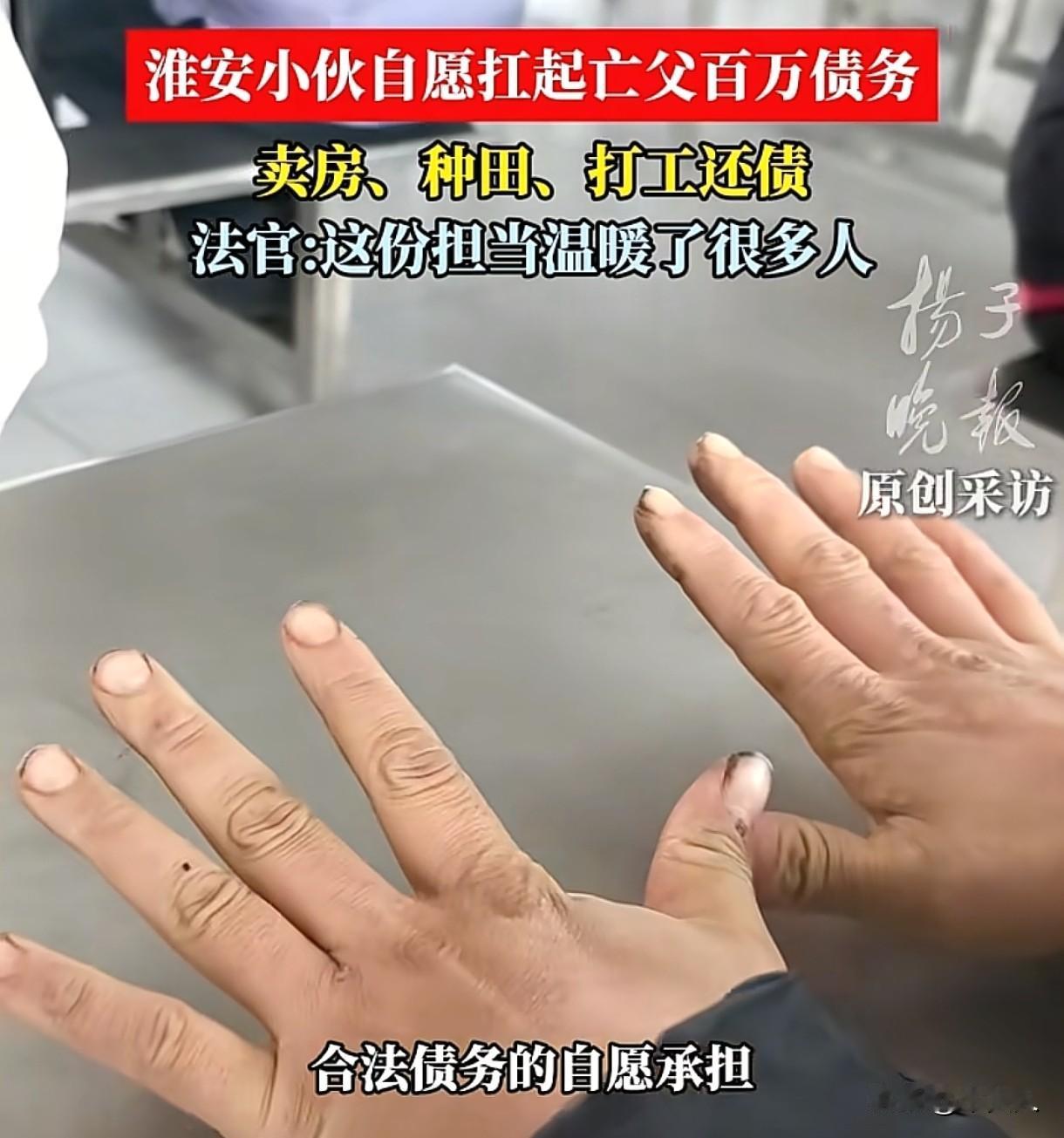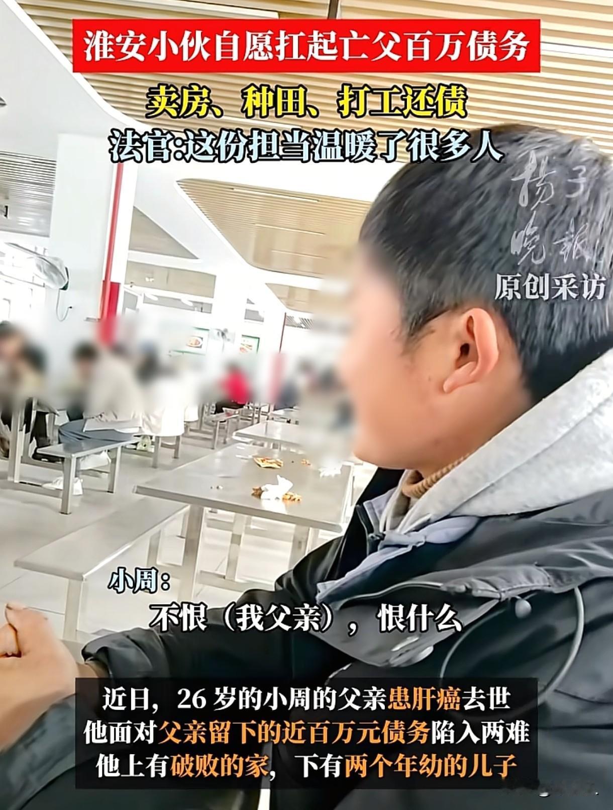 “自愿承担!”江苏淮安,男子的父亲去世后,留下近百万的债务,如果男子放弃继承,可以不承担这些债务,可男子却卖掉婚房、种田、打工,自愿为父亲还债。网友:这份诚信和担当让人感动。 2021年9月,小周的父亲因病去世,父亲离世,没给小周留下什么值钱的东西,除了一间老屋和从村民手中转包的100多亩土地之外,剩下的就是近百万的个人债务。 老周生前没少折腾,他有能力,曾转包了100多亩土地,搞种植和养殖,按理说能挣不少钱,可他嗜赌如命,只要身上有1000元,不输个精光,他绝不回家。 要是输了钱,回家就对妻子拳打脚踢,恶语相向,日子久了,妻子实在受不了,跟他离了婚。 后来老周确诊为肝癌,加上经营不善,家里的经济状况急转直下,到去世时,欠下了近百万债务。 那时,26岁的小周已经结婚生子了,也和妻子生了2个儿子,他一下子就陷入了两难的抉择:是替父亲偿还债务,从此背上还债的枷锁,还是选择放弃继承,从此与这些债务撇清关系、一身轻松? 要是选择放弃继承父亲的遗产,那父亲的债务就跟小周没关系了,他不用为父亲的“烂账”买单,生活或许能轻松点。 但要是不放弃,就得承担起偿还债务的责任,可老周留下的那点遗产,根本不够还近百万的债务,一旦选择承担,这近百万的债务就像一座大山,能把人压得喘不过气。 小周看着被父亲折腾得家徒四壁的家,心中五味杂陈,他还有80多岁的奶奶和两个啥都不懂、需要照顾的幼子要养,生活本就不容易。 和妻子商量之后,他还是下定决心,要扛起这笔债务。 在他心里,父亲就算有再多过错,也是生他养他的亲人,而且他现在也是父亲了,得给儿子们做个好榜样,让他们知道做人得讲诚信,哪怕以后的日子再难,也得咬牙坚持。 对于父亲的债务,小周心里有杆秤,赌债是不受法律保护的,因此父亲欠下的赌债,他不认,但是对于农资款、银行贷款,父亲治病的借款,这些经过法院认可的合法债务,他会努力替父亲还上。 为了早日还清债务,他将自己在县城的婚房卖掉了,又将父亲转包的100亩土地盘活,他自己在工厂上班,每个月能挣7000工资。 对于小周自愿替父亲承担债务的决定,妻子和母亲也很理解和支持他,妻子照顾孩子的同时,还兼职补贴家用,母亲也偶然贴补他们,一家人齐心协力,就为了早日能把债务还清。 小周心里明白,债主们也知道,要是他不愿意替父亲还债,那很可能就人死债消,债主们借出去的钱就很难收回来了。 好在债主们都理解小周的难处,有些债主主动给小周减免了一些债务,比如欠人家3万的,小周还了2万后,剩下的人家也不要了。 这份宽容,让小周很感动,也更加坚定了还钱的决心。 小周曾坦言:如果没有小孩,自己把房子卖了,手里囤十几万不好吗? 有人问他恨不恨自己父亲,小周却说:不恨啊,恨什么,人不就是这样吗?他给你生下来,给你养这么大,有自食其力的能力了,那就行了不,你还指望他给你些什么。 从法律角度来说,该如何看待小周替父亲偿还债务的行为呢? 《民法典》第667条规定:借款合同是借款人向贷款人借款,到期返还借款并支付利息的合同。 小周的父亲跟他人借款,需要在约定的期限内向他人偿还借款,可他去世后,债务问题就留给了他的法定继承人。 有人说父债子偿,小周应该替父亲还债,但是也有人认为人死债消,小周无需还款。 《民法典》第1161条规定:继承人以所得遗产实际价值为限清偿被继承人依法应当缴纳的税款和债务。 超过遗产实际价值部分,继承人自愿偿还的不在此限。 继承人放弃继承的,对被继承人依法应当缴纳的税款和债务可以不负清偿责任。 小周如果没有放弃继承,需要在遗产范围内偿还债务,但是老周留下的东西,是资不抵债的。 小周替父亲还债的行为,并非法律意义上的债务继承,而是对父亲生前合法债务的自愿承担。 他在这么艰难的处境里,始终坚守诚信,用自己的行动诠释了什么是责任和担当,这份诚信和担当难能可贵。 有人说这才是真正的男子汉,大家怎么看吗?