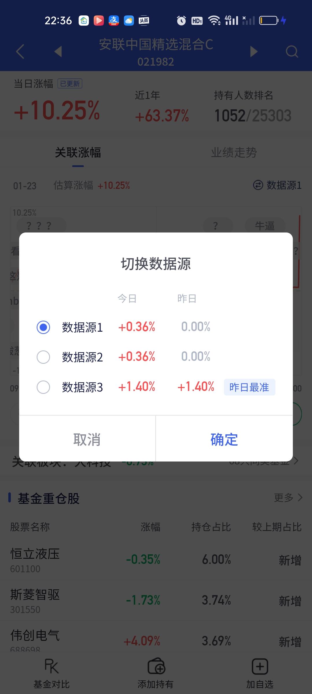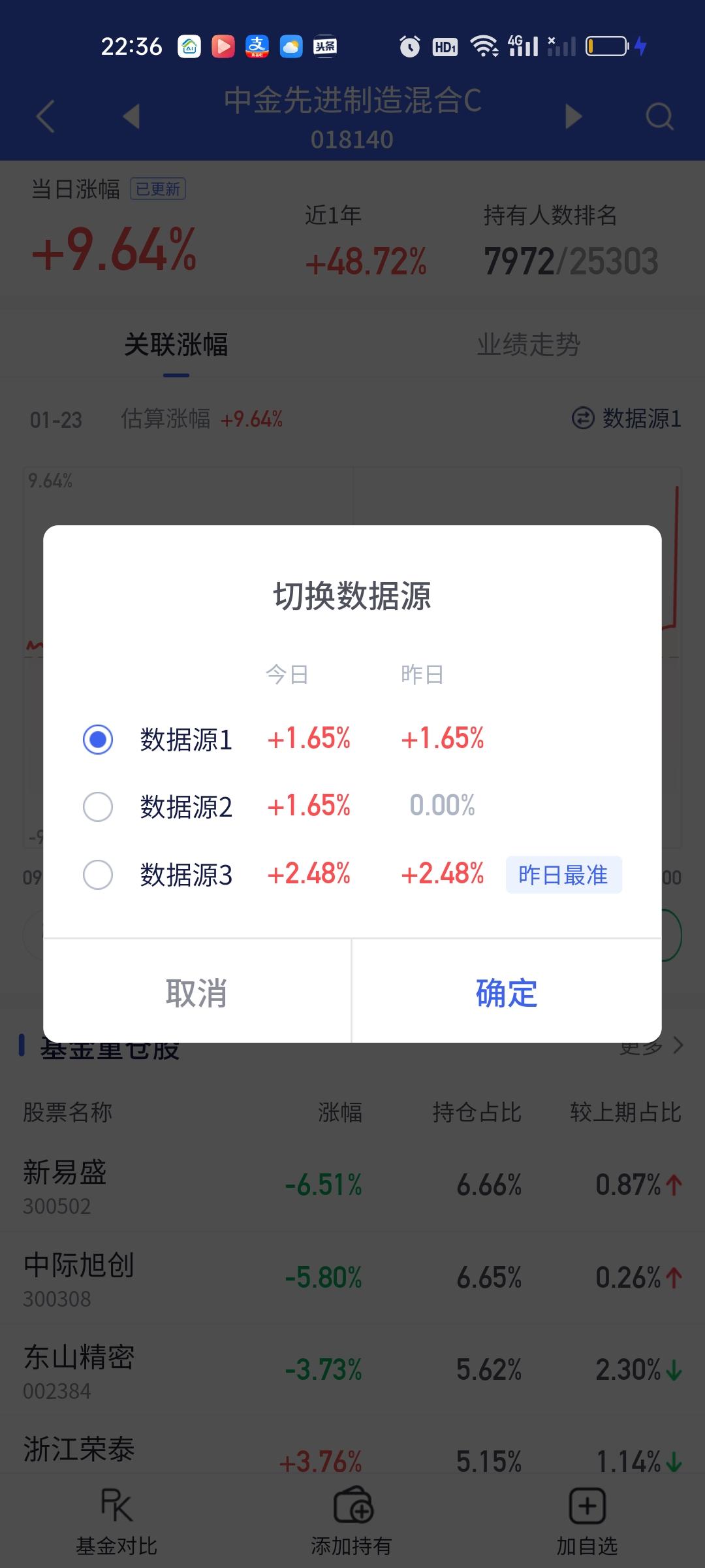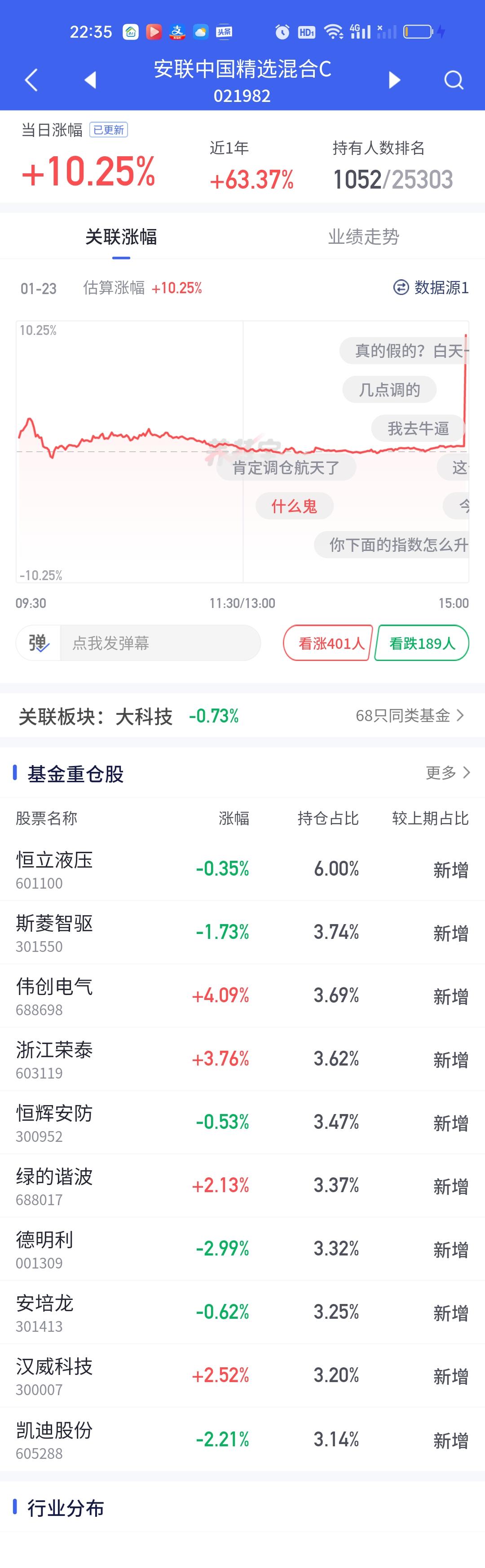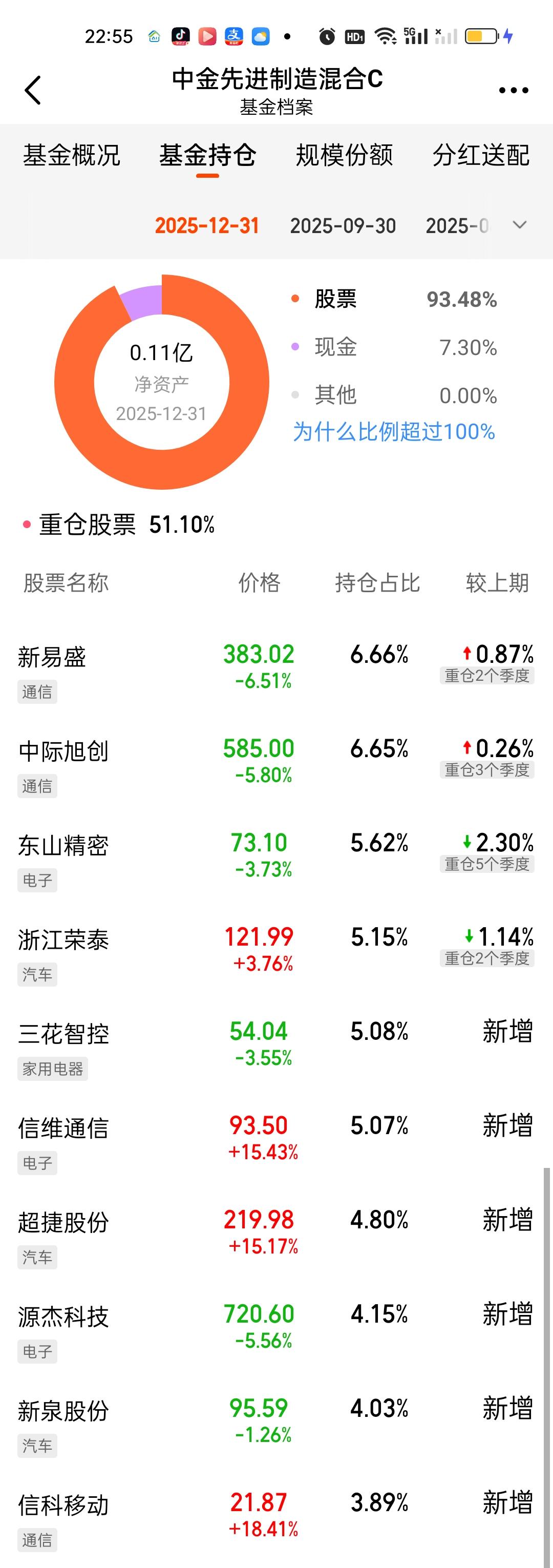 这两只基金今天是超级高开的!安联中国精选预估涨0.36%,开出来涨了10.25%,看持仓能涨0.5%就不错了,所以大概率又调仓换股了,仔细研究了一下它历次的调仓记录,每次调仓都是十进十出的,包括这次调仓也是十进十出。中金先进制造预估涨1.65%结果开出来涨了9.64%,高开了8%,看持仓也是特别分散,拿了好几个板块。基金规模只有0.11亿。