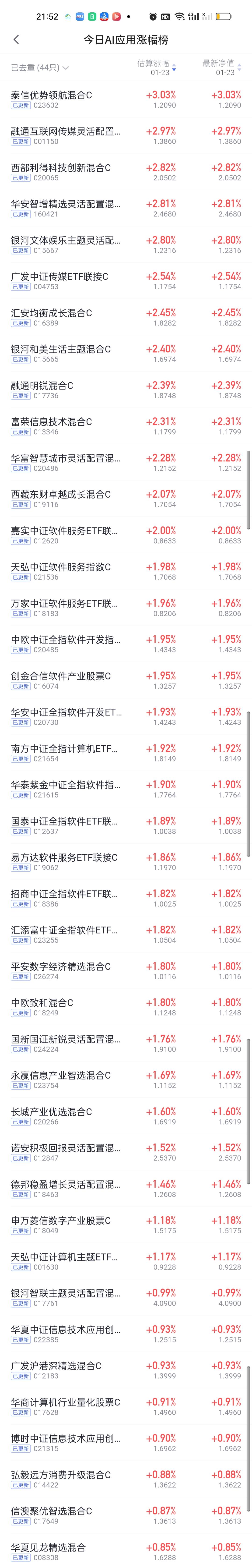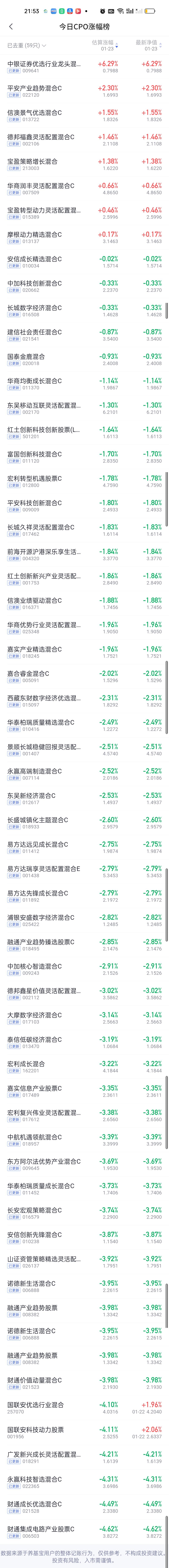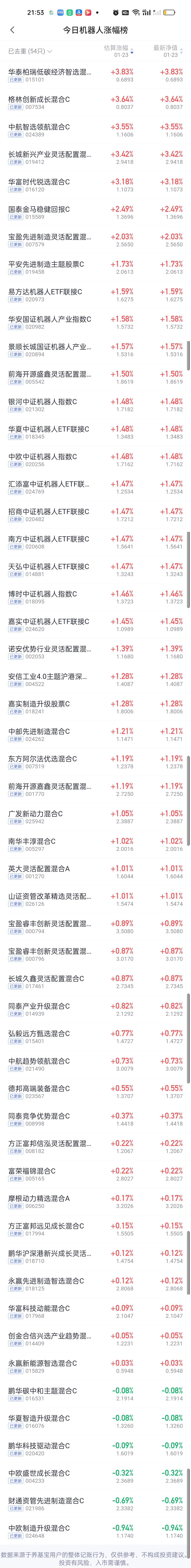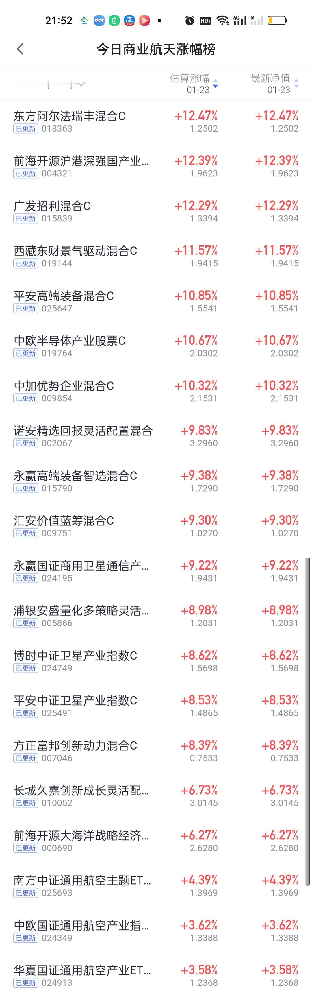 今日基金净值榜已全部更新完毕。涨幅方面,东方阿尔法瑞丰12.47%排名第一,前海开源沪港深强国产业12.39%排名第二,广发招利12.29%排名第三,西藏东财景气驱动11.57%排名第四,平安高端装备10.85%排名第五。 银河核心优势10.78%排名第六,中欧半导体产业股票10.67%排名第七,中加优势企业10.32%排名第八,安联中国精选10.25%,华富物联世界10.08%,诺安精选回报9.83%,中金先进制造9.64%,以及两只永赢紧随其后。 跌幅榜方面,财通景气甄选一年持有期4.71%排名第一,财通集成电路4.62%排名第二,财通品质甄选4.61%排名第三国泰金鑫股票4.58%排名第四,财通成长优选4.49%排名第五,国泰成长优选和永赢科技智选4.31%并列第六。 商业航天,AI应用,半导体,CPO,机器人,创新药涨幅榜一并奉上!