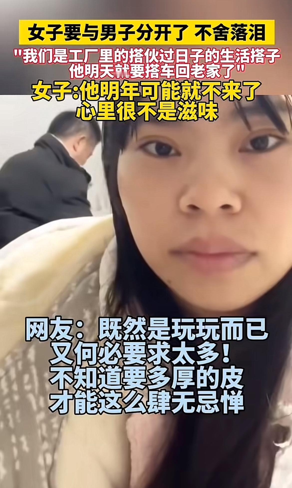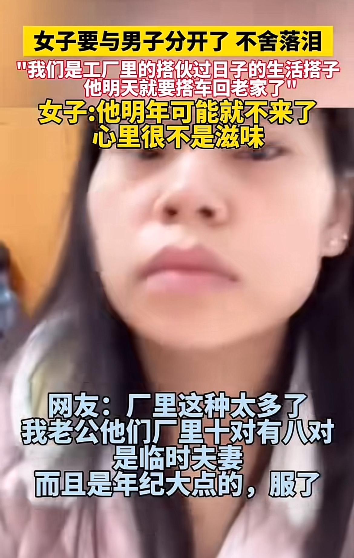 在工厂里,临时夫妻现象并不少见。很多人背井离乡来到工厂打工,为了生活和工作的便利,组成了临时的伴侣关系。 他们白天一起上班,晚上一起回到简陋宿舍,相互扶持,相互慰藉。在这个陌生的环境里,彼此就是依靠。 可这种关系终究是不被世俗完全认可的,每个人都有自己远方的家庭。当要结束这段临时感情时,哪能轻易说再见呢?毕竟一起经历了那么多,有欢笑也有泪水。但为了各自的家庭和未来,又不得不忍痛分开,这其中的无奈和心酸,只有他们自己清楚。