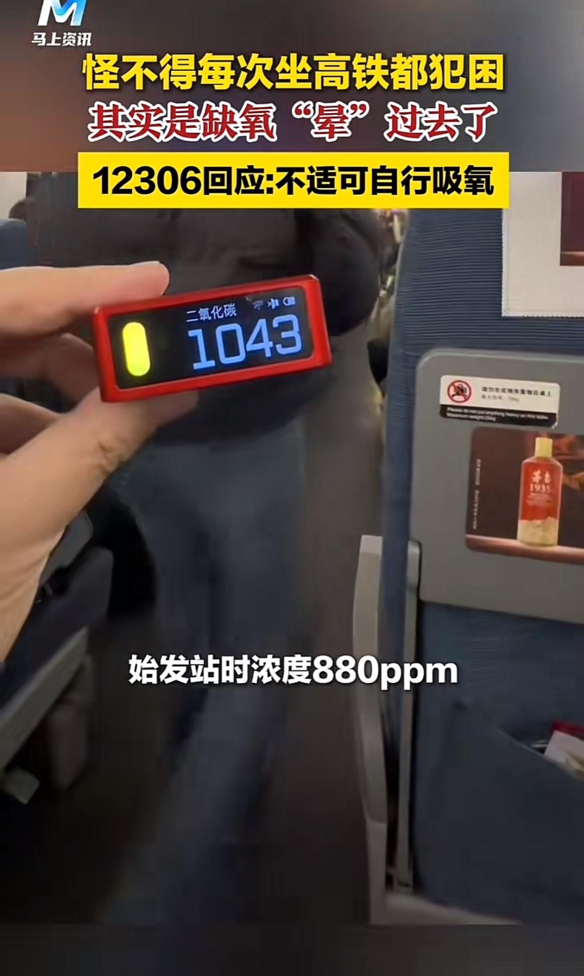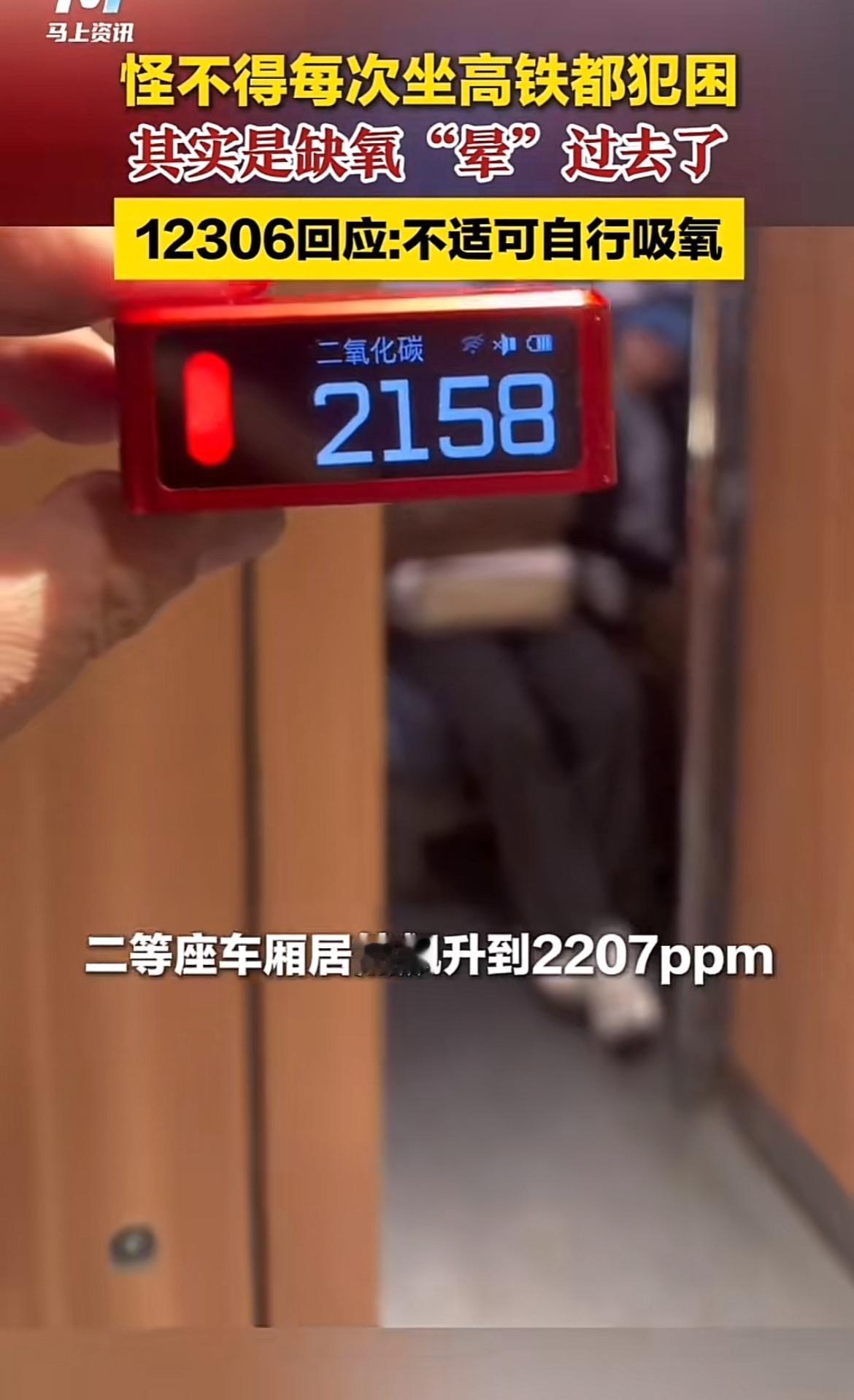 坐高铁容易犯困,原来是二氧化碳在“搞鬼”!近日,从事空气检测的余先生拍视频爆料,高铁二等座入座前二氧化碳浓度约880ppm,入座后开始上涨,行驶一阵就超2000ppm,这时好多乘客都睡着了。余先生常要在高铁办公,却总忍不住睡着,所以才做了这个测试。 国内《室内空气质量标准》规定,室内二氧化碳浓度应≤1000ppm,这车厢里都超标一倍了。高浓度二氧化碳不仅让人犯困,还会抑制大脑中枢,影响决策和认知。打给12306,客服要么让“自行吸氧”,要么说“没标准”。高铁这二氧化碳问题,真该重视起来了!