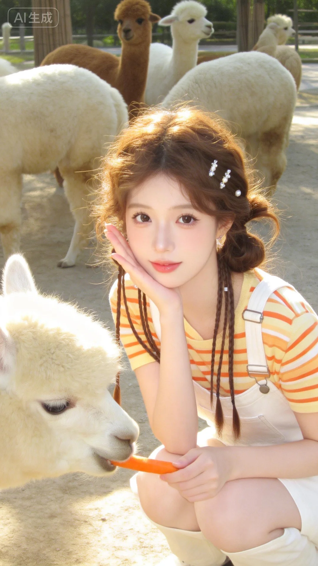 东亚美少女,唯美高清全身照,冷白皮,美艳无双,风情万种,棕色卷发做慵懒盘发造型。细小发光珍珠和碎钻发夹,饰品作为核心元素,搭配超细多条辫子繁杂编发,身穿极繁杂工艺一套橘黄色条纹前卫韩版网红穿搭浅色服饰,白色背带裤,纤细手指轻遮脸颊。朦胧的光影与唯美背景。美女蹲着拿着胡萝卜喂羊驼,背景一群羊驼,全身照高清写真,原相机实拍,面容精致,面部特写,氛围自然松弛慵懒又随性,慵懒氛围感,表情可爱,随手一拍、抓拍,眼神自然不失真,氛围感美学,光影氛围感,姿势随意,ccd拍摄,手机拍摄风格。电影质感,超级细节画质,8k超清画质,近景,光影斑驳。柔和的光线笼罩。表情可爱。构图随意却尽显生活中的绚丽日常。阳光透过发丝照在脸上,突出冷白皮通透自然的肌肤状态,整体神态灵动又不失随性。唯美的氛围感。写实摄影风格,保留轻微的噪点,高光不过曝,阴影有细节,表情自然松弛慵懒休闲,皮肤美白透亮,甜美氛围,独特韵味的美。单反相机效果,大焦距特写,超高清图。