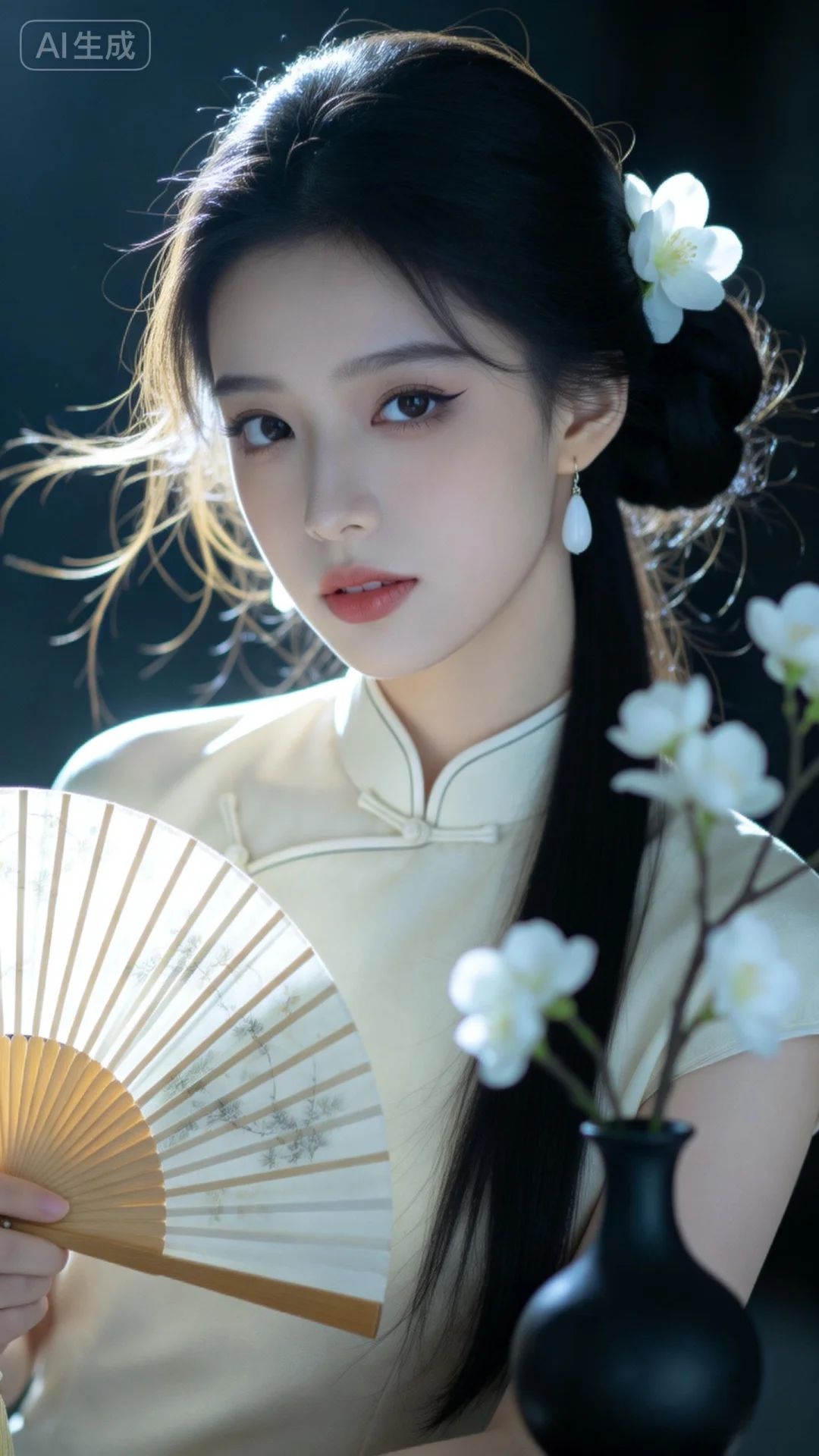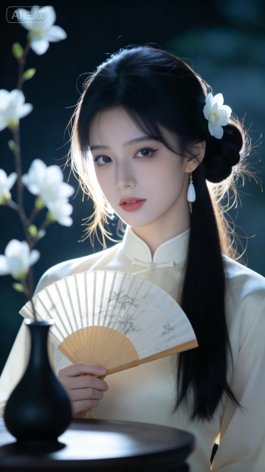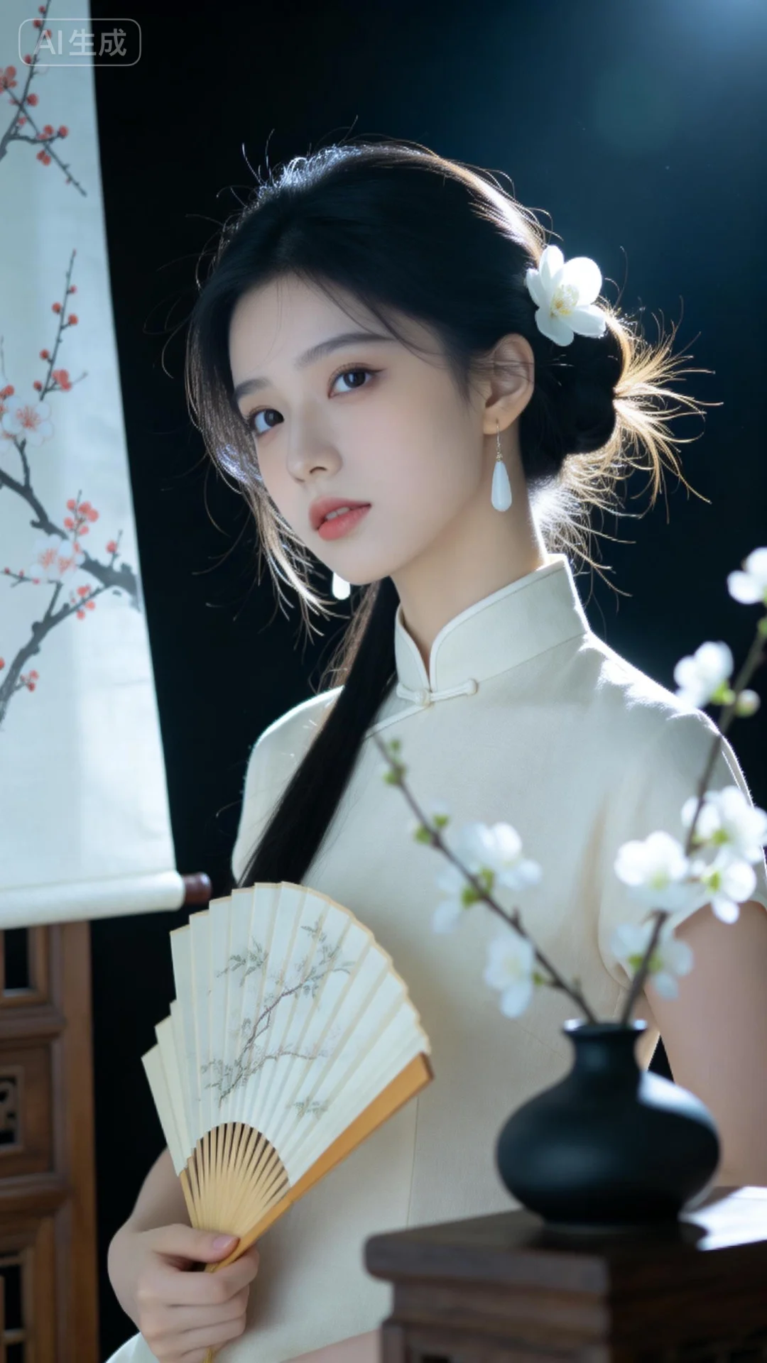 真实摄影,绝美美少女,幼态脸,黑色长发(半盘起,侧饰白色花朵,精致典雅),佩戴白色耳饰(简约优雅,与整体风格协调),身穿浅米色中式旗袍套装(立领设计,尽显古典韵味),手持木质折扇(扇面有淡雅花纹,增添文雅气息),旁边有黑色花瓶插白色花枝(中式花艺,增强古典氛围),正面身处中式背景场景(带有梅花图案的布幔,木质家具,营造出静谧雅致的中式古典氛围),整体风格古典、雅致,充满中国风的诗意与柔美,倾斜构图,仰视角度,情绪写意,专业模特神情,表情细腻且自然,情脉脉的眼神,情绪氛围感拉满。冲突视觉,夸张酷镜头,强烈的光影对比,强烈的对比色碰撞。发型光,脸部补光,柔和侧光,发丝金光,光影对比,暗调的背景营造出静谧的氛围,光影斑驳,画面层次丰富,强烈的光影,脸部清晰,超高颜值,五官立体,瓜子脸,身材完美,妆容精致,蓬松凌乱的头发,肤色冷白自然,皮肤光滑。高级感,电影质感,高清画质,细腻真人皮肤纹理,前景虚化,背景虚化。
