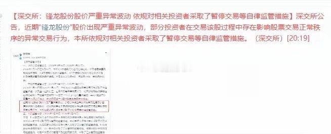 锋龙股份18连板,刷新A股连板记录!停牌无果继续连续涨停之后,今天晚上拔网线,暂停大户交易。今天不拔网线,下周锋龙也是断板预期,今天锋龙股份历史天量换手,换手19.20%,成交38.46亿。这个拔网线,不知道是暂停的之前大户的交易权限,还是今天买入的大户权限。今天这个换手,之前的大户赚的盆满钵满肯定是获利了解出货走了,而今天今天进场接力的大户,散户如果被拔网线,那可就惨了。之前几个连板先停牌再拔网线,这次直接18连板才拔网线,还是天量换手之后,有点意思。