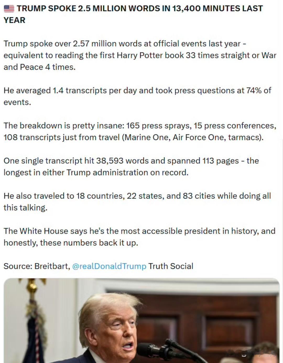 特朗普去年在官方活动中讲话总计250万字,耗时13400分钟 特朗普去年在官方活动中发表了超过257万字的讲话——相当于连续读33遍《哈利·波特》第一本,或者4遍《战争与和平》。 他平均每天完成1.4篇文字记录,并在 74%的活动中回答媒体提问。 具体数据相当惊人: 165次随行问答 15次新闻发布会 仅出行(空军一号、陆战队一号、停机坪)就有108篇文字记录 其中有一篇文字记录长达38593字,共113页,创下特朗普政府有史以来最长记录。 在此期间,他还访问了18个国家、22个州、83个城市,同时完成了所有这些讲话。 白宫说他是历史上.最.亲.民.的.总.统,最爱发表言论,这些数据确实也证明了这一点。