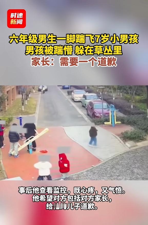 “严查到底!”1月22日,浙江湖州,一男子见儿子迟迟不回家,便去小区公园寻找,结果在草丛发现儿子蹲在里面哭,身上还有个脚印,查看监控后,才知道儿子被一名六年级男孩狠狠踹飞,并且对方家长毫无歉意!网友:天生就坏! 事情其实不复杂,但越细想越让人寒心,全程没有任何夸张,全是实打实的真实情况。 当天,一名男子发现自家7岁的儿子出去小区公园玩后,迟迟没回家,心里越想越着急,赶紧起身去公园找人。 整个公园找了一圈,最后在一片草丛里,找到了蹲在那儿哭的儿子,孩子低着头,肩膀一抽一抽的,胸前还赫然留着一个清晰的脚印。 男子赶紧蹲下来问孩子怎么了,可孩子哭得太伤心,半天说不出一句完整的话,只知道一个劲儿地哭。 看着儿子委屈又害怕的样子,再看看那个明显的脚印,男子意识到事情不简单,立刻去调了小区公园的监控,这一看,彻底让他怒火中烧。 监控画面拍得清清楚楚,当时一群孩子在公园的健身器材区域玩耍,他的儿子也在其中。 后来孩子看到草丛边似乎有什么东西,就好奇地走过去看了看,没做任何出格的动作,就在他转身准备回到小伙伴身边时,旁边一个穿黑衣、体型比他壮一圈的男孩,毫无预兆地突然抬脚,狠狠踹在了他的胸口。 那一脚的力气不小,7岁的小男孩当场就被踹飞出去,重重摔在地上。 更让人揪心的是,孩子爬起来后,没有哭喊,也没有还手,只是低着头,默默走开,找了处没人的草丛蹲下来,一直哭到被父亲找到,后来男子才知道,那个踹人的男孩,是一名六年级的学生。 男子说,他从来没想过要什么赔偿,也不想跟对方起冲突,毕竟都是邻里街坊,可自家孩子平白无故受了委屈,还受了惊吓,他只想要对方男孩,还有对方的家长,能给自己的儿子道一个诚恳的道歉,让孩子心里能好受一点。 可让人没想到的是,他找到踹人男孩的家长后,对方却没有丝毫歉意,既不关心受伤的小男孩,也不愿意道歉,这份冷漠,比踹人的那一脚更让人寒心。 网友们看到这件事后,纷纷怒喊“天生就坏”,其实能理解这份愤怒,但说白了,没有天生就坏的孩子,只有不会教育、不愿承担责任的家长。 六年级的孩子,已经十二三岁,早就懂得什么是对什么是错,能毫无缘由地对一个比自己小好几岁的孩子下这么重的手,背后多半和家庭教育脱不了关系。 如果家长平时能好好管教,能教会孩子尊重他人、懂得分寸,大概率不会发生这样的事。 而且家长的态度,其实就是孩子最好的榜样,对方家长这种毫无歉意、拒不负责的样子,只会让孩子觉得,自己做错事也没关系,不用承担任何后果,久而久之,只会养成更恶劣的性格。 反过来想,如果家长能主动站出来道歉,好好管教孩子,既能给受伤的小男孩一个交代,也能让自家孩子认识到错误,这才是最该做的事。 这事没有什么复杂的是非对错,错的就是踹人的男孩,还有拒不道歉的家长。受害者家长的要求真的不高,只是一个道歉,一份尊重,可就连这点,对方都不愿意满足。 希望这件事能得到合理处理,给受伤的孩子和家长一个交代,也给所有家长提个醒,管教孩子,从来都不是一句空话,承担责任,才是为人父母最基本的底线。 对此您有什么不同的看法,可以在评论区留言讨论!!! 信息来源:《六年级男生一脚踹飞7岁小男孩男孩被踹懵躲在草丛里家长:需要一个道歉》时速新闻
