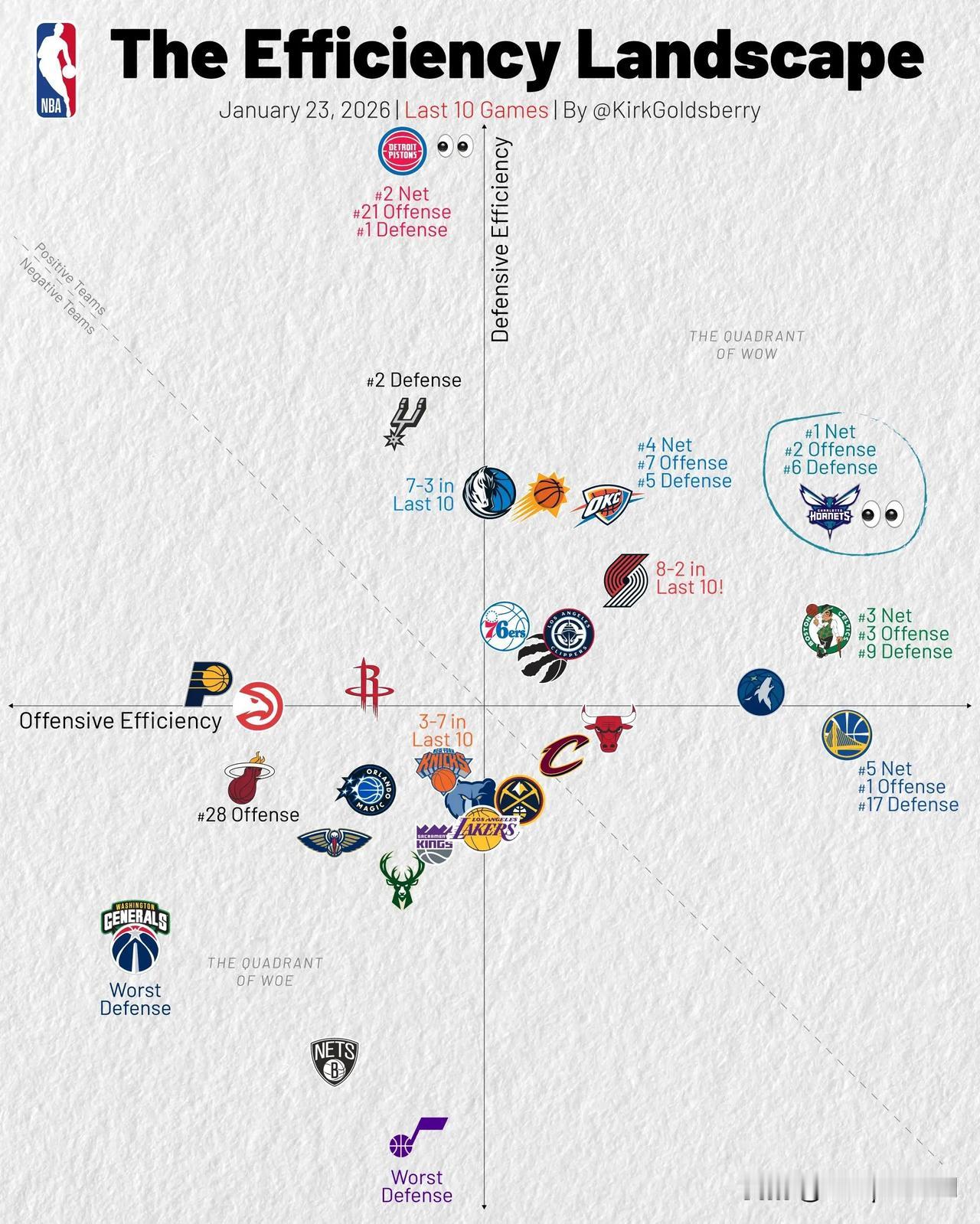 美记Kirk Goldsberry制图晒出近10场联盟攻防效率图。 黄蜂净效率值第一,进攻效率第二、防守效率第六; 活塞净效率值第二,进攻效率第二十一、防守效率第一; 凯尔特人净效率值第三,进攻效率第三、防守效率第九; 雷霆净效率值第四,进攻效率第七、防守效率第五; 勇士净效率值第五,进攻效率第一、防守效率第十七; 注意事项: 1. 黄蜂第一次拿到第一! 2. 马刺防守高居第二! 3. 开拓者拿到8胜2负! 4. 活塞防守断层领先! 5. 独行侠拿到7胜3负!