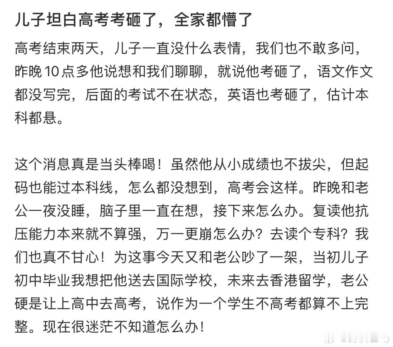 儿子坦白高考考砸了,全家都懵了