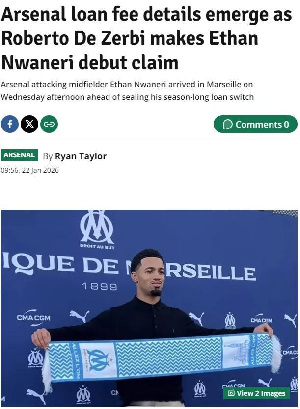 阿森纳镜报和伦敦足球记者RT发文谈到了恩瓦内里的租借条款。报道称,马赛将为阿森