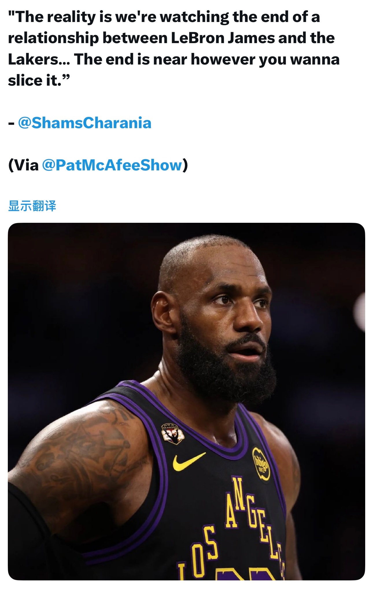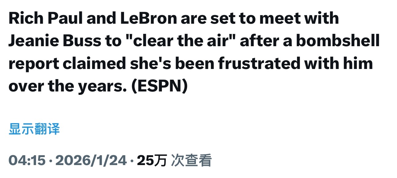 据ESPN报道,在重磅消息称珍妮·巴斯多年来一直对勒布朗感到不满后,里奇·保罗将与勒布朗一同和珍妮·巴斯会面,以“消除误会、澄清事实”。Shams则在播客中表示:“现实就是,我们正在见证勒布朗·詹姆斯和湖人这段关系走向终点。不管你怎么解读,结局都已近在眼前。”