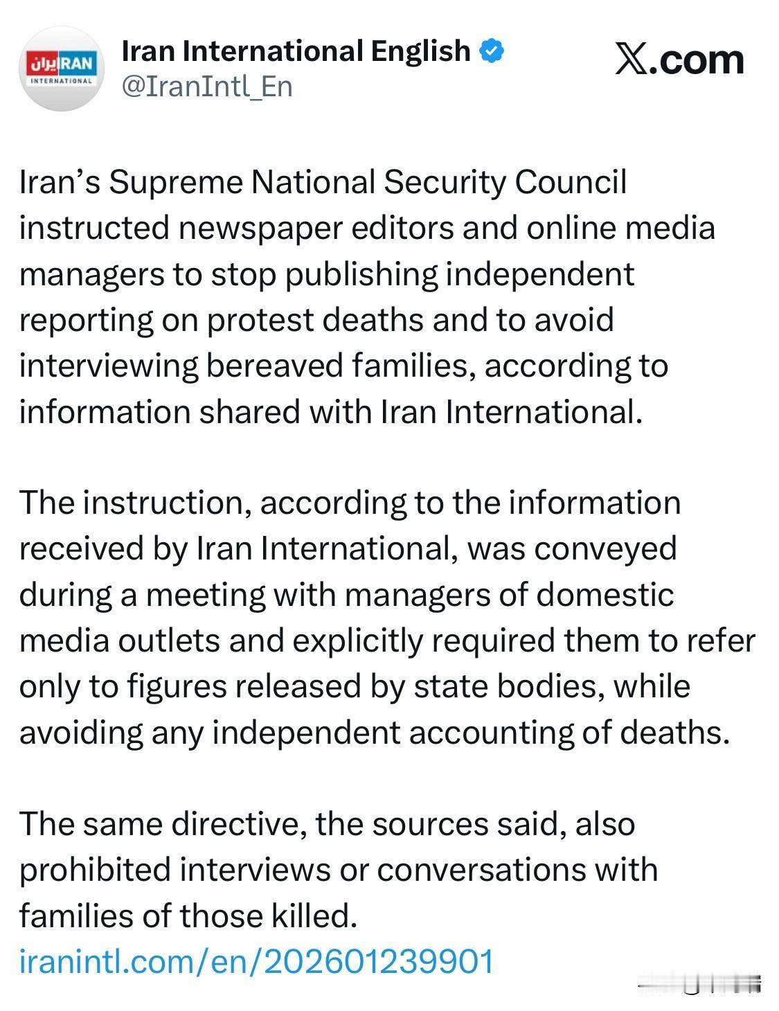 据伊朗国际电视台报道,伊朗最高国家安全委员会指示报纸编辑和网络媒体管理人员停止发表有关抗议活动死亡事件的独立报道,并避免采访遇难者家属。 据伊朗国际电视台获得的消息,该指示是在与国内媒体机构负责人的一次会议上传达的,明确要求他们只能引用国家机构公布的数字,同时避免对死亡人数进行任何独立统计。 消息人士称,同一项指令还禁止对遇难者家属进行采访或交谈。