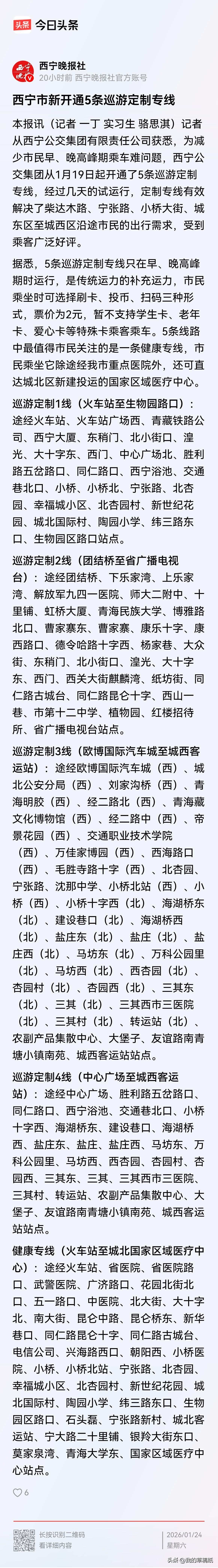 西宁公交放大招,新开5条巡游定制专线,早晚高峰挤车难终于有解了! 西宁人注意,你们吐槽多年的早晚高峰“公交攻坚战”迎来神器助阵!1月19日起,5条巡游定制专线正式上线,专治各种“挤不上、等不及”! 这波操作太精准——专线只在早晚上下班高峰开跑,纯粹就是给常规线路“打辅助”的补充运力。效果立竿见影,短短几天就救了柴达木路、宁张路、小桥大街以及城东到城西沿线无数打工人,好评刷屏! 最亮眼的是其中一条“健康专线”,串起重点医院,直通城北新投用的国家区域医疗中心,就医出行方便多了。 划重点:坐车和普通公交一样,刷卡、投币、扫码都行,全程通票2元。但请注意,暂时不支持学生卡、老年卡、爱心卡等特殊优惠证件。 5条线路覆盖火车站、生物园、团结桥、城西客运站等多个关键点位,高峰期出行,认准巡游定制专线,终于能喘口气了!