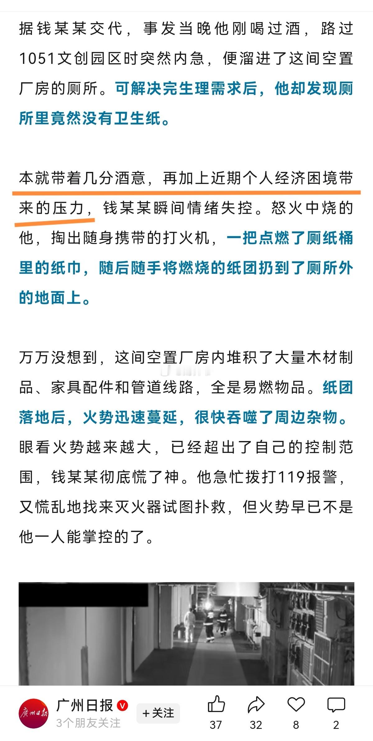 【“剧情反转”——绍兴凌晨发生一起火灾,现场浓烟滚滚,起火原因披露:主动报警的“热心市民”就是纵火者,因上厕所没纸愤怒纵火】这些年大家都不容易,一定要控制好自己的情绪!