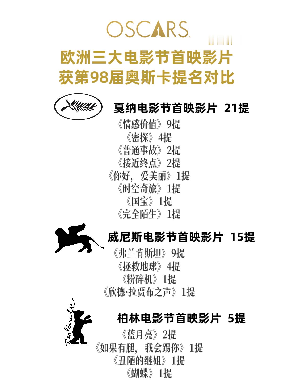 欧洲三大电影节首映影片获第98届奥斯卡提名对比,戛纳电影节依然遥遥领先,共有8部世界首映影片获得21项提名;威尼斯电影节则紧随其后,4部世界首映影片获得15项提名;柏林电影节相较上一届略有提升,4部影片获得5项提名。🌿戛纳电影节首映影片 21提《情感价值》9提《密探》4提《普通事故》2提《接近终点》2提《你好,爱美丽》1提《时空奇旅》1提《国宝》1提《完全陌生》1提🦁威尼斯电影节首映影片 15提《弗兰肯斯坦》9提《拯救地球》4提《粉碎机》1提《欣德·拉贾布之声》1提🐻柏林电影节首映影片提名 5提《蓝月亮》2提《如果有腿,我会踢你》1提《丑陋的继姐》1提《蝴蝶》1提
