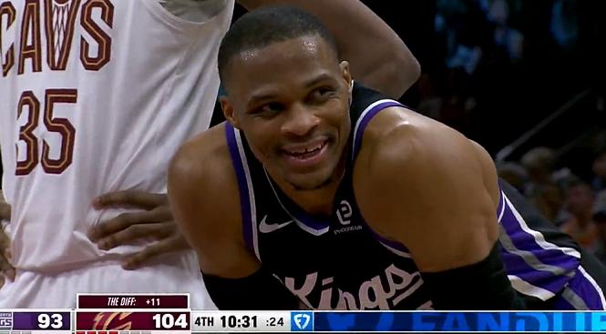不服老不行,威少面对空篮上飞,随即露出尴尬笑容。 今天上午的一场比赛,国王对阵骑士,比赛进行到第四节时,球场上出现了颇为搞笑的一幕。威少持球来到篮下,在没有防守的情况下,莫名其妙的将篮球上飞了。或许由于太过于离谱,威少面露笑容,来缓解尴尬。 有一说一,近期威少表现不错,场均能得到20多分,但年龄是摆在他面前最大的难题。本场比赛,他在第四节露出疲态。 此球要是搁年轻那会,直接暴扣了,而现在上篮都上不进。显然,威少跳不起来了,38岁的他也不得不服老了。 看到威少,不得不提一下詹姆斯,41岁的他快攻,扣篮,盖帽信手拈来,如同探囊取物。要知道,今年的老詹已经41岁,此威少足足大了3岁。