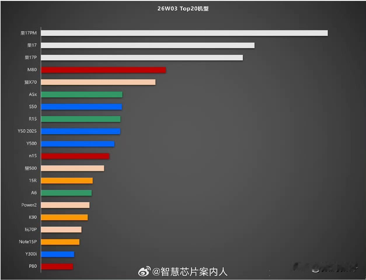 上周销量前20机型排行[灵光一闪]第一第二第三名还是iPhone17系列,华为mate80也稳定在前五当中,货足够多[捂脸]除了去中端机剩下都是低端机型了,友商的A系列和Y系列机型不少,华为mate80/pura80上榜,荣耀X70一直排名就很靠前,这次power2也上榜了,等后面推出新机X80估计也会上榜[奸笑]大电池还是太香了