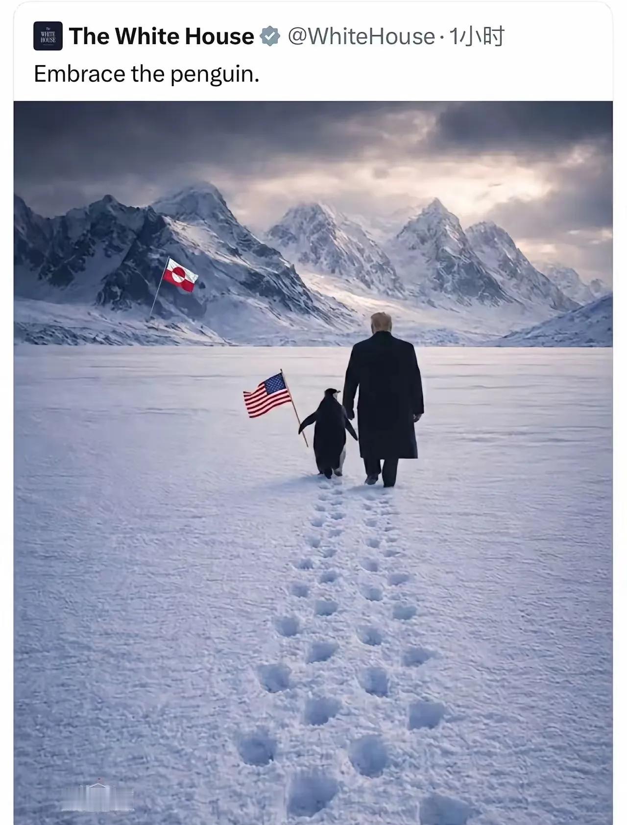 白宫刚发了张官方AI P图造势,结果直接把常识按在地上摩擦——特朗普牵着只举美国国旗的企鹅走在格陵兰岛冰原上,配文还写着“拥抱企鹅”,可全世界都知道,格陵兰岛根本没有企鹅啊! 本来这图是想帮特朗普宣传“拿下格陵兰岛”的想法,结果成了大型科普现场。网友扒出《国家地理》早就辟谣过,企鹅全住在南半球,北极地区连个企鹅影子都没有,白宫这是把南极洲和格陵兰岛搞混了?加拿大前国防部长都吐槽:“地球上最强大的国家,运营得跟马戏似的”。 更搞笑的是,这企鹅还举着美国国旗,旁边插着格陵兰岛旗帜,画面看着挺唬人,实则漏洞百出。网友们纷纷整活:有人P了特朗普牵北极熊的图,说“这才符合地域特色”;还有人调侃“下一个目标是南极洲?毕竟那儿才有企鹅”。 特朗普之前就总把冰岛和格陵兰岛搞混,这次团队又犯这种低级错误,难怪被群嘲“没常识”。本来想靠P图刷存在感,结果反倒暴露了无知,这波操作真是搬起石头砸自己的脚,笑料值直接拉满!