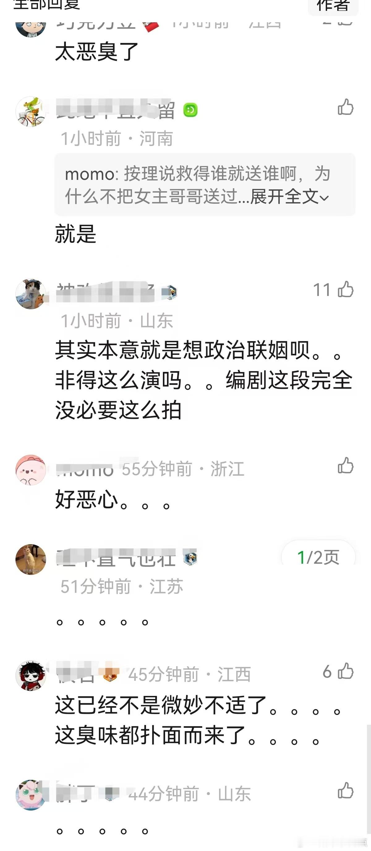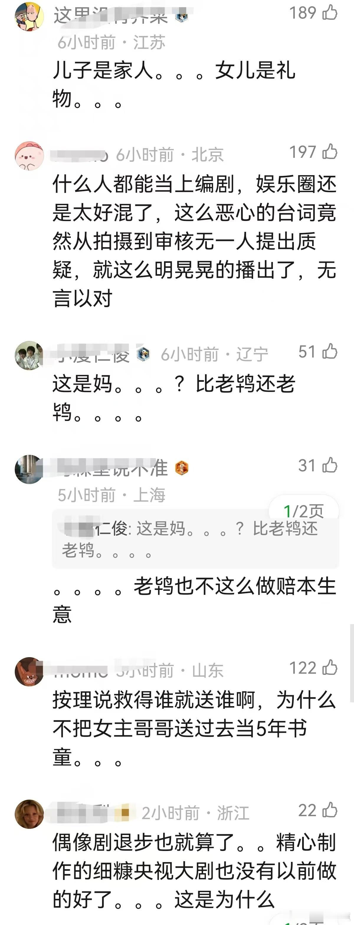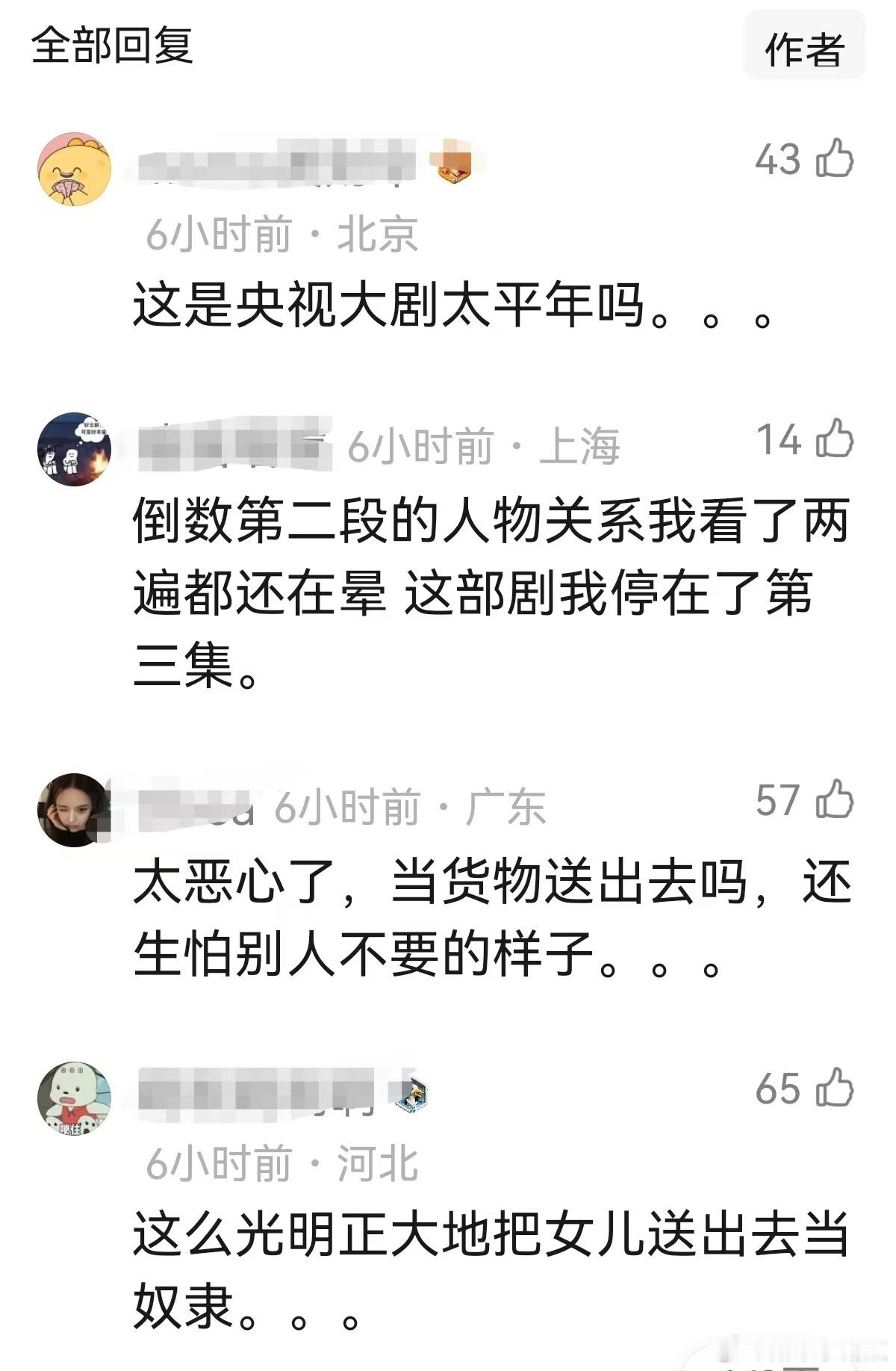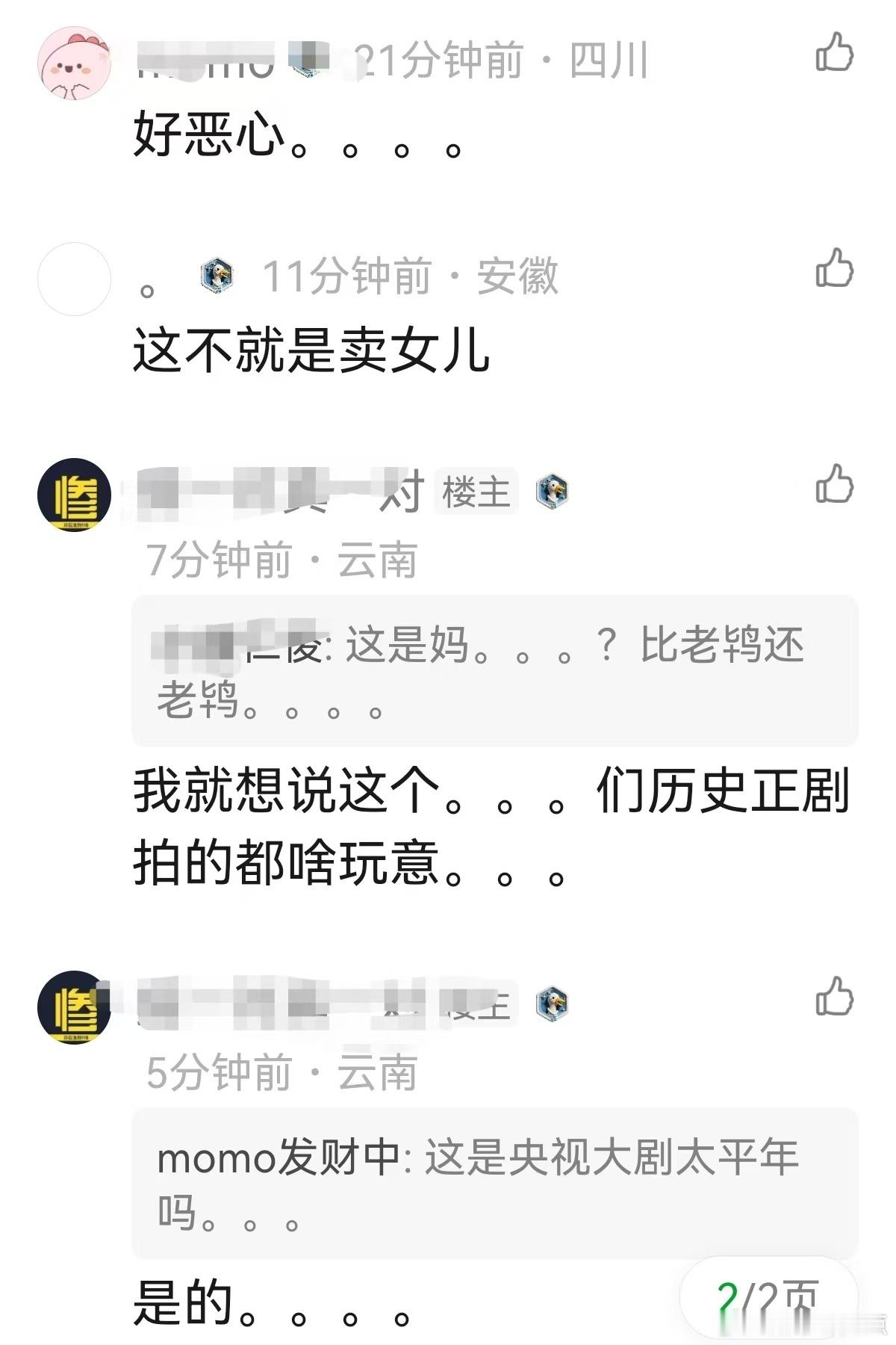 看了几集《太平年》我真是忍不住要吐槽了,明明是制作精良的大剧,偏要加这种恶臭情节,要是有历史依据还能理解,若只是编剧导演的恶趣味,那真的太败好感了。梅婷演的母亲护儿子时各种霸气护短,对女儿却如此轻贱,内娱能不能在所谓尊重历史的同时,既尊重女性角色,也尊重演员的表演啊!真的被这段剧情膈应到了!男主救了女主哥哥,女主母亲直接让女儿去伺候男主五年报恩,这台词和设定也太窒息了吧?“伺候”“破身”这些词挂在嘴边,男女主明明还是孩子,母亲却当着舅舅的面盘算着五年内女儿被男主破身,舅舅还夸她考虑周全,这什么离谱三观?