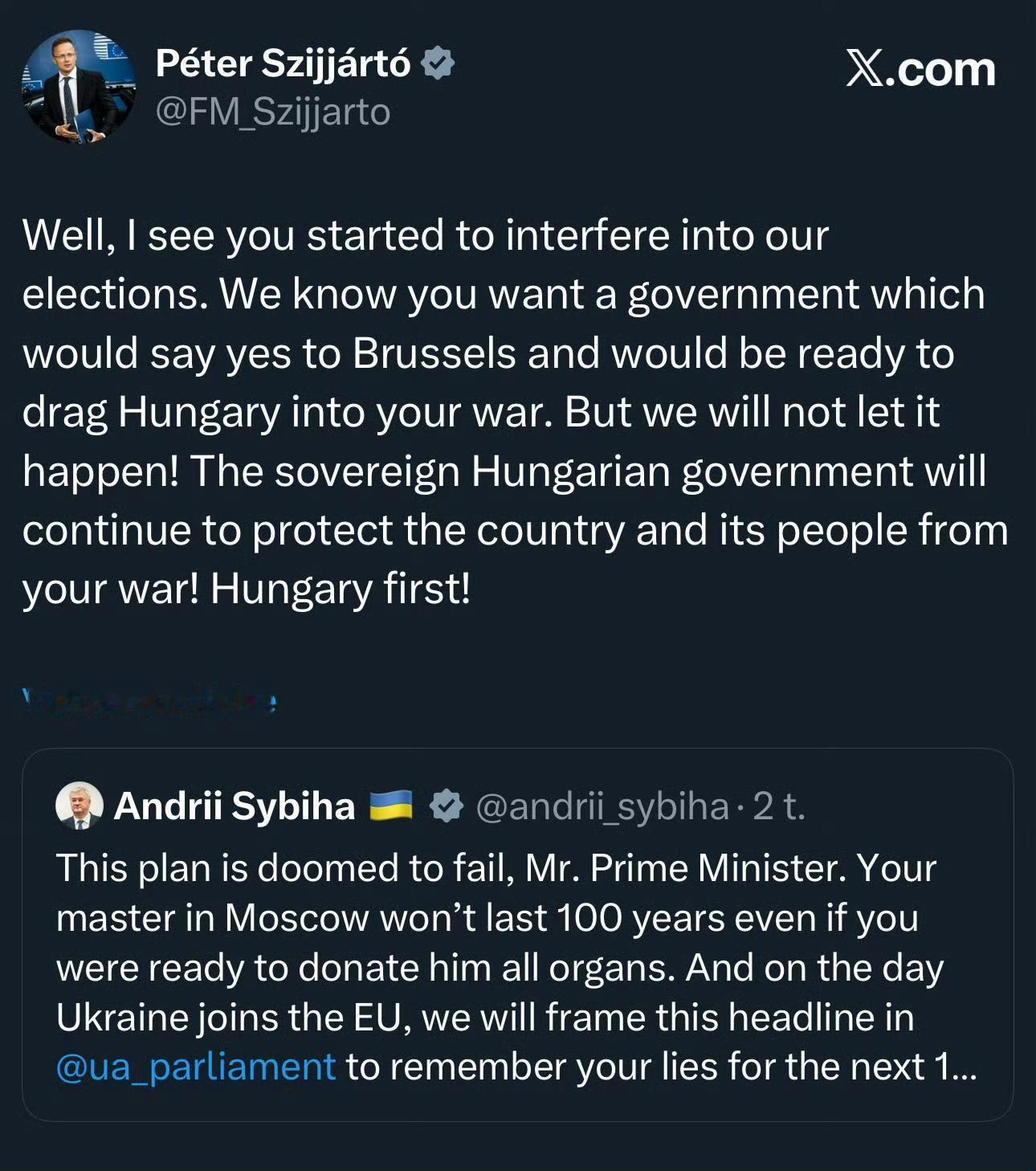 匈牙利总理欧尔班在乌克兰总统泽连斯基在达沃斯经济论坛发表完演讲后, 接受采访时称 :" 匈牙利100年内议会不会投票赞成乌克兰加入欧盟".乌克兰外长西比加发文回怼欧尔班 :" 这个计划注定失败, 总理先生,即便您愿意为他献出自己所有的器官, 您在莫斯科的主子甚至撑不了一百年,在乌克兰加入欧盟之日, 我们将在最高拉达展示这句话,让人们未来一百年都铭记您的谎言。"而匈牙利外交部长彼得·西雅尔多又发文怼乌克兰外长西比哈:“看来你已经开始干涉我们的选举了,我们知道你想要一个对布鲁塞尔唯命是从、准备把匈牙利拖入你们战争的政府。但我们绝不会让它得逞!匈牙利主权政府将继续保护国家和人民免受你们战争的侵害!匈牙利优先!”国际局势海外新鲜事热点现场