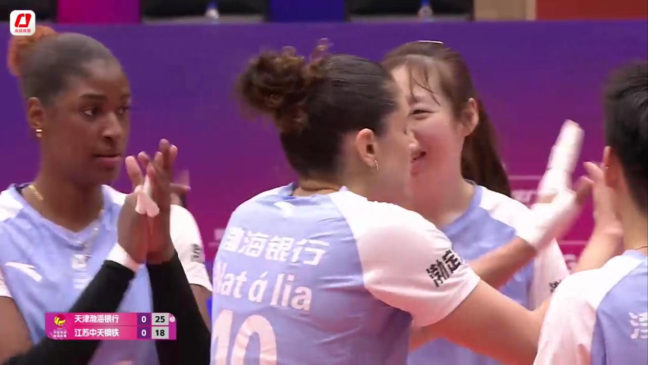 女排联赛焦点战:25-18、21-25,天津1-1江苏。 1月24日,女排联赛常规赛A级第十一轮,6胜4负积17分排名第5的天津渤海银行女排主场迎战8胜2负积23分排名第2的江苏中天钢铁女排。 天津女排是战绩显赫的老牌强,江苏女排是卫冕冠军,两支球队球迷众多,每次交锋都格外引人关注。本赛季第四轮两队首次交锋,天津女排客场先赢两局的情况下,被江苏队连扳三局逆转。两队再次狭路相逢,出场人员都有所调整,均派出最强阵容出战。天津队首发阵容二传朱航霆、接应李响,主攻娜塔莉娅、刘美君,副攻小马丁内斯、刘敏乔,自由人孙婉鋆;江苏队首发阵容为二传张籽萱,接应周页彤,主攻吴梦洁、唐欣,副攻杨佳、万梓玥,自由人倪非凡。 第一局,天津队开局不利2-6落后,主教练陈方叫暂停调整后,6-6追平比分;江苏队失误偏多,9-11落后,主教练施海荣叫了第二次暂停;战至局中,天津队16-12领先4分;后半局,天津队一鼓作气,没有给江苏队任何机会,以25-18先赢一局。 第二局,江苏队重振旗鼓,开局9-2领先7分;随后,天津队展开追分模式,一度追至20-21,仅相差1分;关键分,娜塔莉娅扣球出界,周页彤反击得分,江苏队以25-21扳回一局。两队战成1-1平。