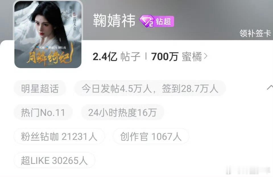 鞠婧祎超话粉丝突破700万鞠婧祎超话700万粉丝 超话700万+2.4亿帖子双丰收,鞠婧祎的吸粉体质太绝了,蜜橘永远为你撑腰!
