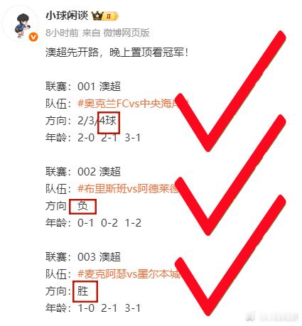 早场爆收!澳超三场全红:001进球数、阿德莱德追分、麦克阿瑟打穿,一个都没落下!恭喜一起狂揽18394的兄弟们,这份胜利属于每一个信任小球的人!看到大家收米开心的样子,真的比什么都值得。最近虽然有些小风小浪,但挡不住咱们连红的势头。今晚决赛夜,我只支持一个结果:中国队冠军!今晚的赛事解析和三串一精选已经准备就绪,置顶解锁即可获取。错过早场的兄弟,今晚这一单千万不能再掉队了。咱们置顶见,继续收割!亚奥赛中国U23vs日本U23五大联赛这里有料