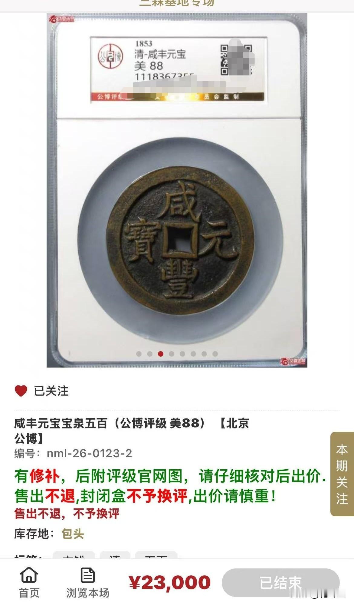 看这枚公博评级的咸丰当五百拍了多少钱? 昨天晚上20点截拍的一枚咸丰元宝当五百,公博评级为88分,经过多次竞拍,以23000元落锤,你感觉这个价格是高还是低呢? 在高峰期,如此品相的,怎么也得到三万甚至更多,现在低潮期?咸丰大铜钱 咸丰样币 咸丰当百铜钱 咸丰当百价格 咸丰重宝铜钱 白铜咸丰大钱