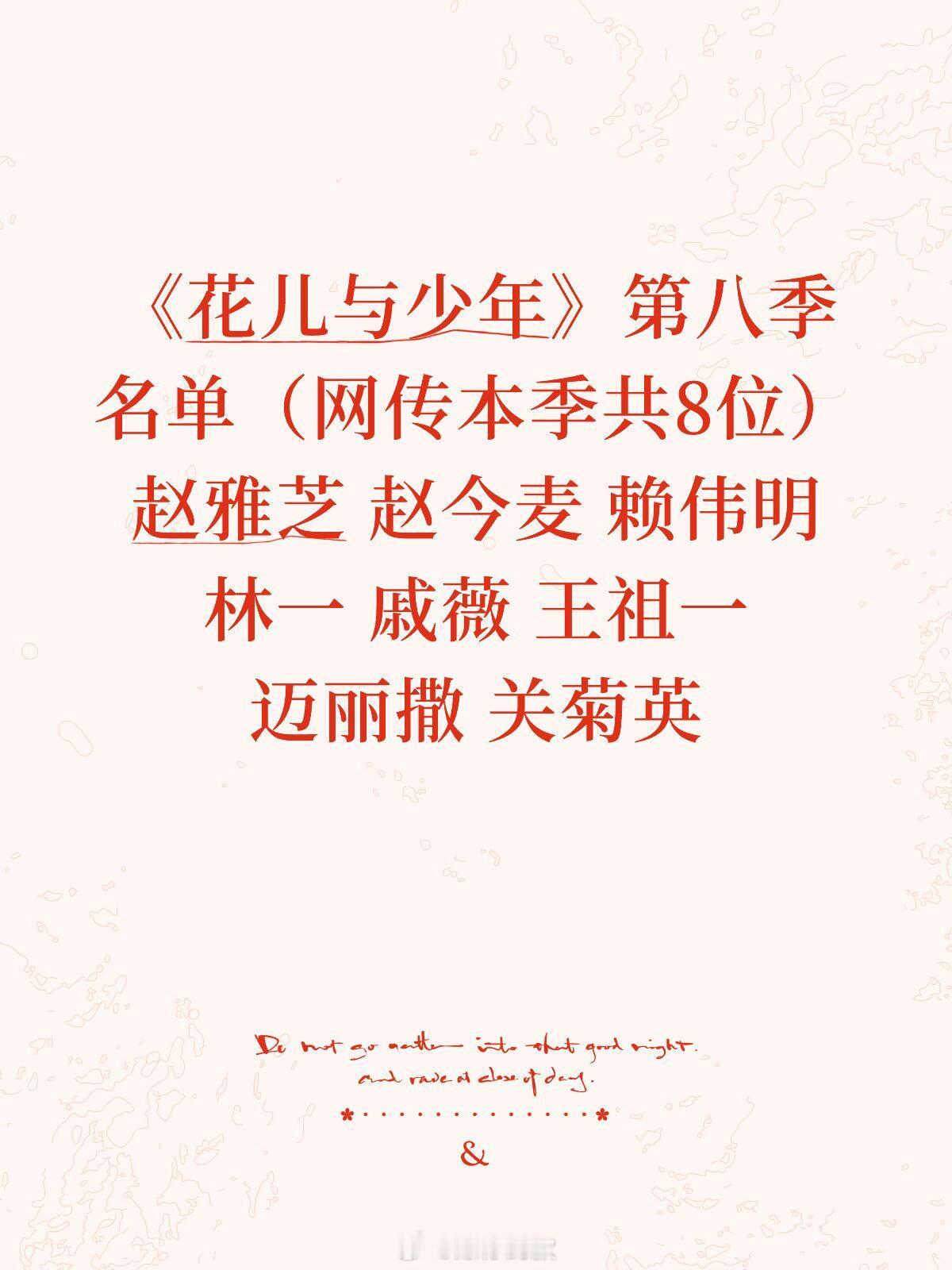 网传《花儿与少年》第八季名单(网传本季共8位)赵雅芝 赵今麦 赖伟明林一 戚薇 王祖一迈丽撒 关菊英