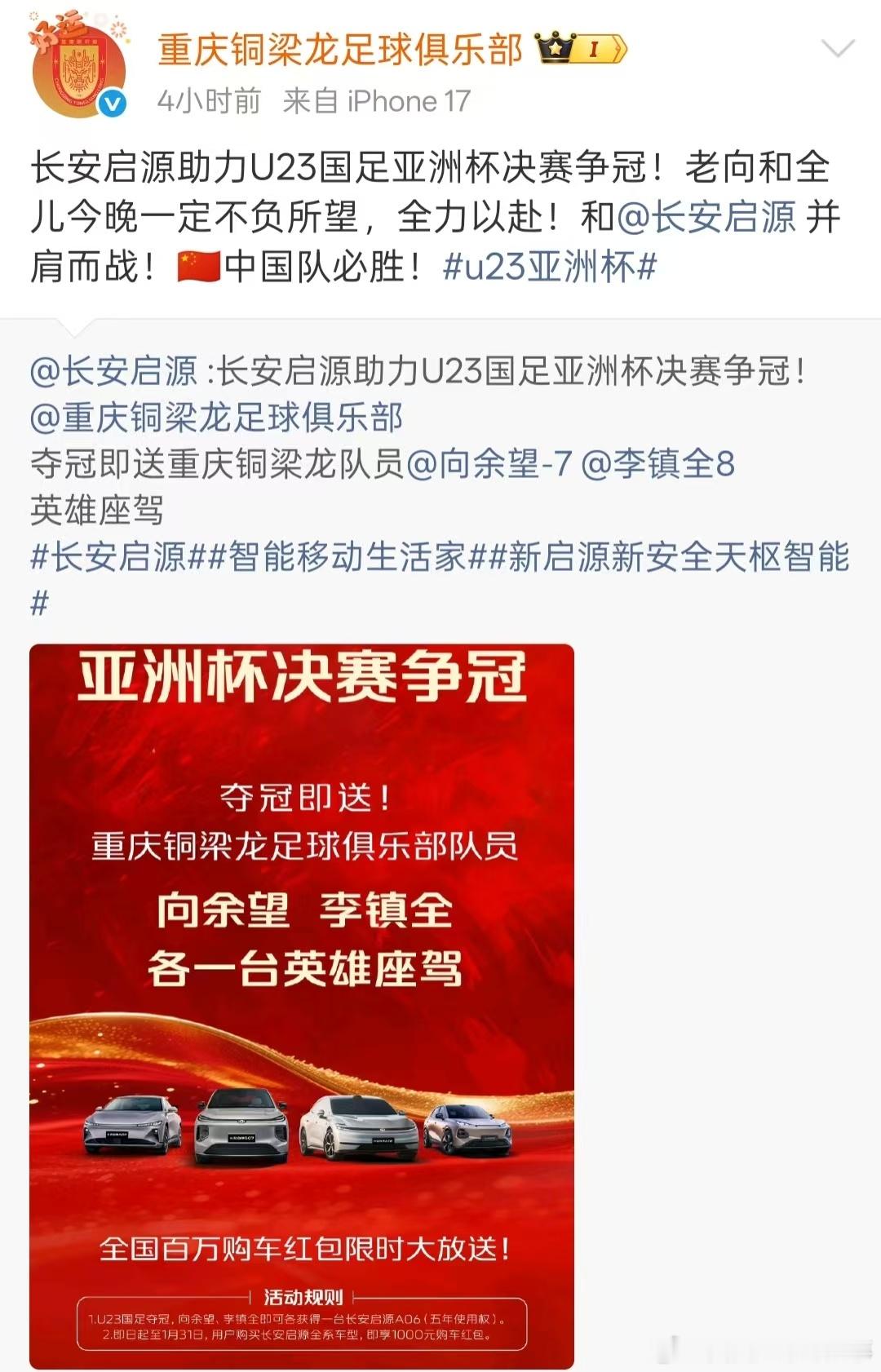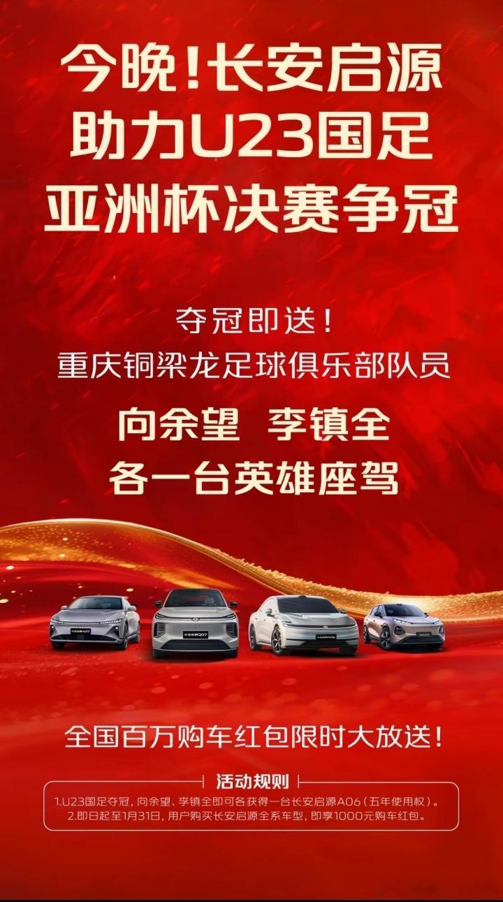 长安启源宣布若U23国足最终夺冠,重庆球员将获得一台车的5年使用权。长安启源与重庆铜梁龙官方发布微博:如果今晚U23亚洲杯决赛中国队最终夺冠,将给重庆铜梁龙球员向余望和李镇全“赠送”英雄座驾(5年使用权)。U23国足vs日本U23亚洲杯