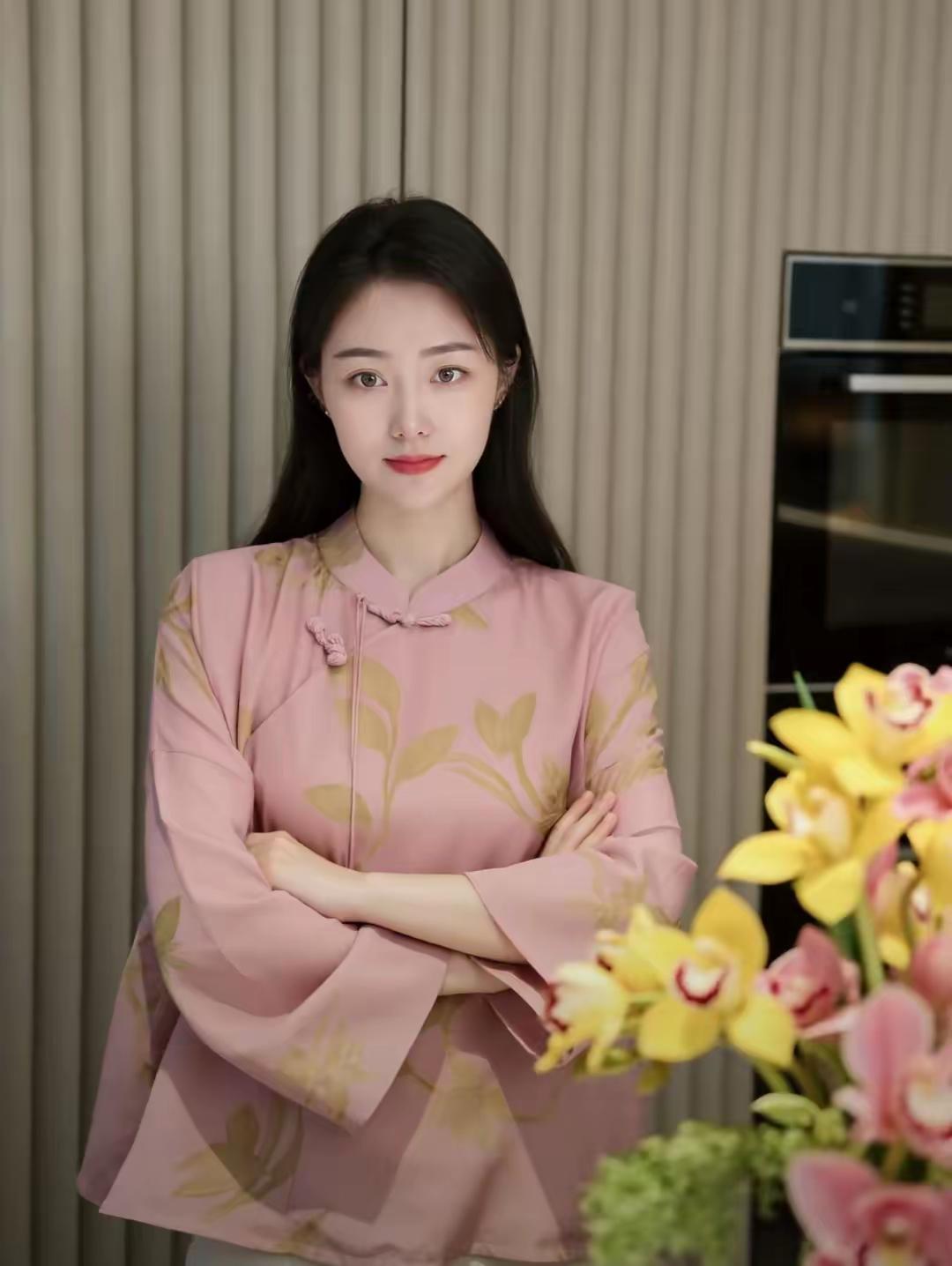 优雅气质,粉色旗袍,花团锦簇,尽显东方韵味。
