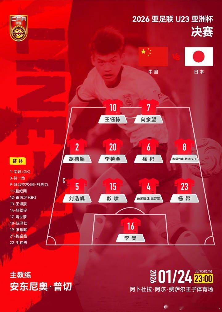 官方公布U23国足阵型👇U23国足vs日本U23亚洲杯 门将:16-李昊后卫:4-吾米提江、5-刘浩帆、15-彭啸、23-杨希中场:6-徐彬、20-李镇全、2-胡荷韬、木塔力甫前锋:7-向余望、10-王钰栋