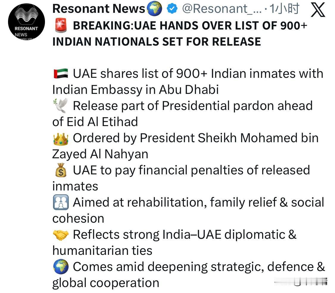 根据 2026 年 1 月的最新消息,阿拉伯联合酋长国(UAE)近期向印度驻阿布扎比大使馆移交了一份名单,确认将释放 900 多名 在阿联酋服刑的印度公民。 此次释放是根据阿联酋总统谢赫·穆罕默德·本·扎耶德·阿勒纳哈扬(Sheikh Mohamed bin Zayed Al Nahyan)于 2025 年 11 月 签署的一项总统特赦令执行的。该特赦令原本是为了庆祝 2025 年 12 月 2 日 的阿联酋国庆节(Eid Al Etihad),当时共特赦了 2,937 名不同国籍的囚犯。 2026 年 1 月 22 日左右,阿联酋官方正式向印度使馆提供了这 900 多名印度籍囚犯的详细名单。目前,印度驻阿布扎比大使馆正在协调身份核实、文书处理及随后的遣返事宜。作为此次特赦的一部分,阿联酋领导人承诺将代为偿还这些囚犯所欠的财务罚款和补偿金。这一举措旨在减轻囚犯家庭的经济负担,并为他们回国重新开始生活提供机会。 此次大规模释放被视为印度与阿联酋之间外交关系日益深化的体现。目前约有 350 万印度人居住在阿联酋,这一人道主义行动进一步加强了两国在战略和民生领域的合作。