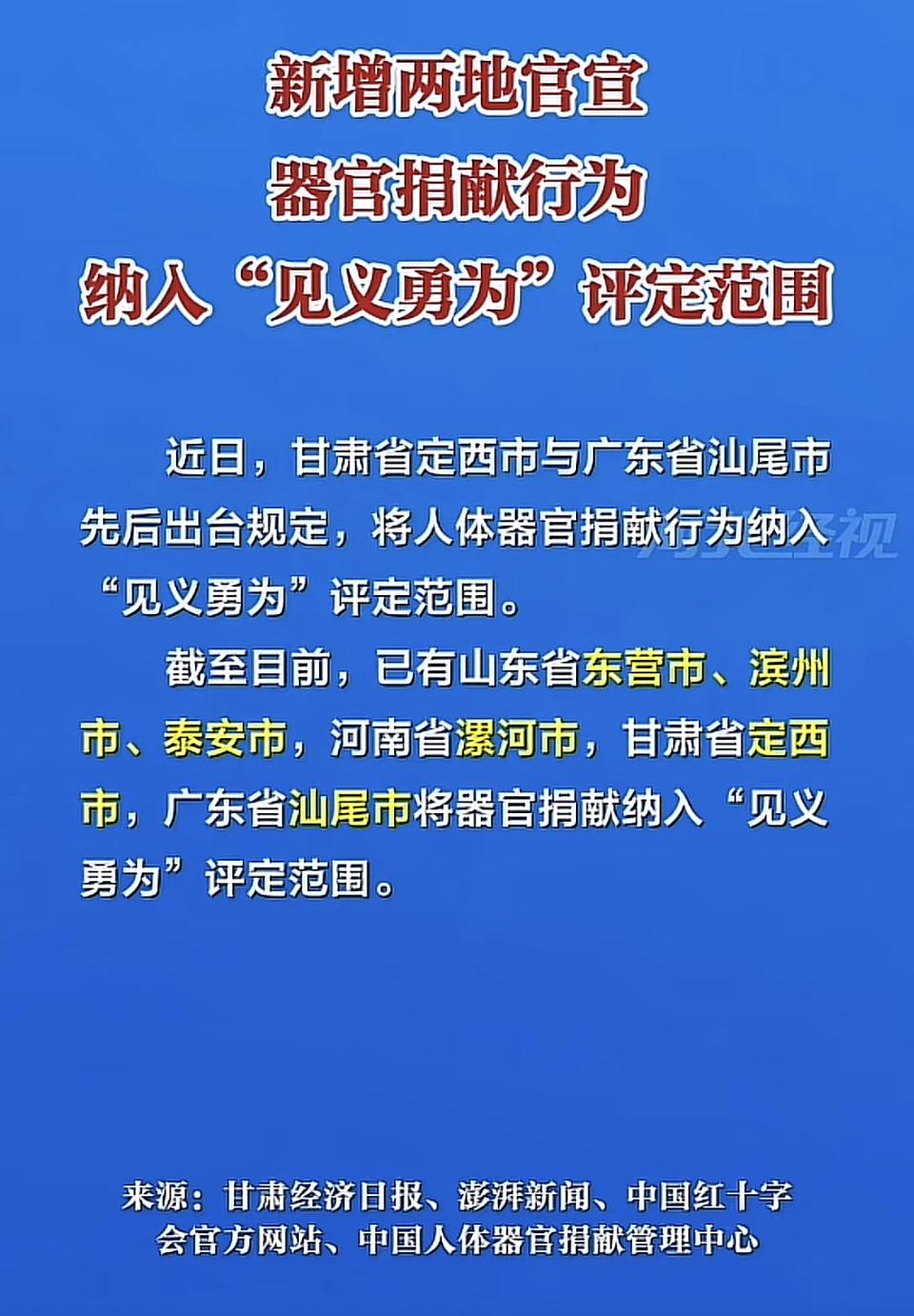 必须给甘肃定西和广东汕尾这波操作点赞!近日,这两地先后出台规定,把人体器官捐献行为纳入“见义勇为”评定范围。截至目前,加上山东东营、滨州、泰安和河南漯河,全国已有6地这么做了。 定西市红十字会等多部门联合发文,明确成功捐献造血干细胞与遗体器官捐献可申报见义勇为。捐献者或家属凭相关证书就能申请,还能获得对应称号,家属也享受相关政策。政府序列事业单位工作人员捐献,考核、晋升还优先考虑。这不仅是对善举的认可,也激励更多人加入,以“制度致敬”弘扬人间大爱。 见义勇为 见义勇为基金案 广东器官捐献 汕尾献血 陕西见义勇为 定西救援 普宁献血