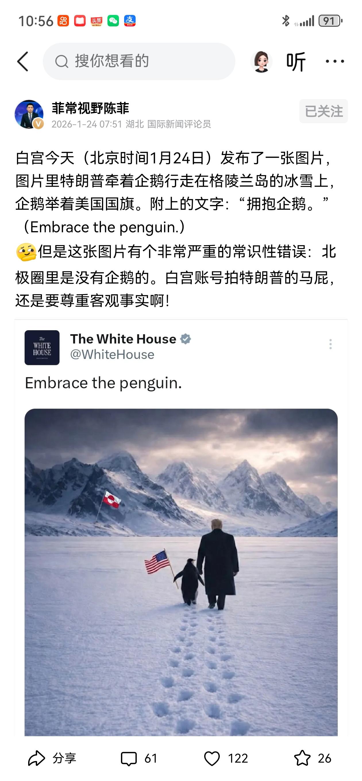 美国白宫今天(1月24日)发布特朗普牵着企鹅行走在格陵兰岛的冰雪之上的图片,附上的文字是“拥抱企鹅”,意在拥有格陵兰岛的未来。尽管图片有违北极没有企鹅的基本常识,但白宫秘书菜维特定会解释称,由于受中俄的“威胁”,企鹅都跑到南极去了,但随着美国占领格陵兰岛,现在企鹅又回来了。 1月20日,特朗普发布率副总统、国务卿在格陵兰岛插旗图片,21日英国《金融学人》发布特朗普骑北极熊封面;昨天德国《明镜》周刊发布欧盟、法国、德国、意大利及丹麦领导人组成的欧洲“复仇者联盟”封面,并附有“唐纳德,请适可而止!”文字。围绕格陵兰岛话题,“文明”世界好不热闹!