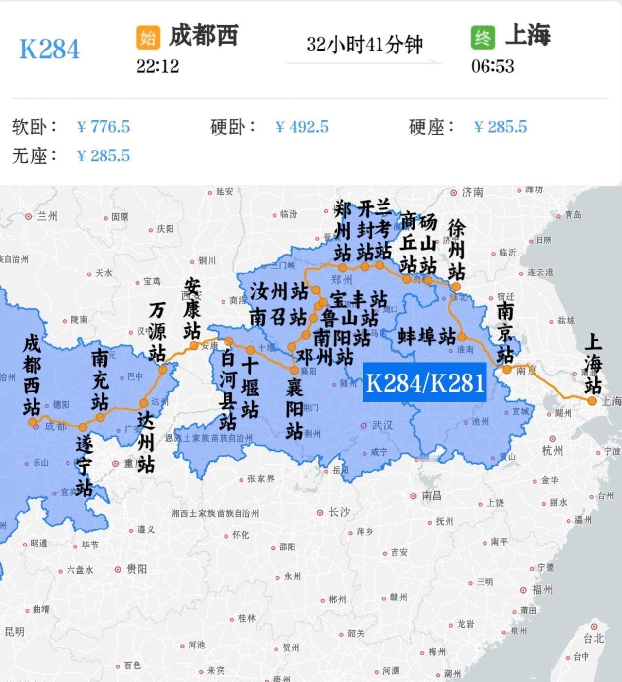 2026年1月25日起上海到成都西K282/K283次列车调整运行区段,上海到安康段行驶线路不变,安康到成都段不再经阳安铁路、宝成铁路行驶,改由襄渝铁路、达成铁路行驶。 调整后列车经京沪铁路、陇海铁路、焦柳铁路、襄渝铁路、达成铁路行驶,增加停靠万源站、达州站。 2026年1月26日起成都西到上海K284/K281次调整运行区段,成都到安康段不再经宝成铁路、阳安铁路行驶,改由达成铁路、襄渝铁路行驶,安康到上海段行驶线路不变。 调整后后列车经达成铁路、襄渝铁路、焦柳铁路、陇海铁路、京沪铁路行驶,增加停靠遂宁站、南充站、达州站、万源站。
