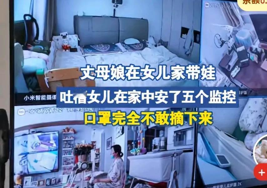 丈母娘在女儿家带娃,每天戴着口罩,闷的难受, 有人说闷就把口罩摘下来, 女子说我敢摘下吗, 女儿在家中安了五个监控, 女儿女婿都能随时查看, 还有几个大屏幕, 随时都能看到自己在干嘛, 弄的我跟进了保安室似的, 我想换个内裤,都转了几圈,找不到隐蔽的地方。 网友说,这看孩子跟进监狱似的, 妈妈也是够听话的, 没点人身自由了, 一点隐私权也没有了。 幸亏是丈母娘,要是婆婆又闹矛盾了。
