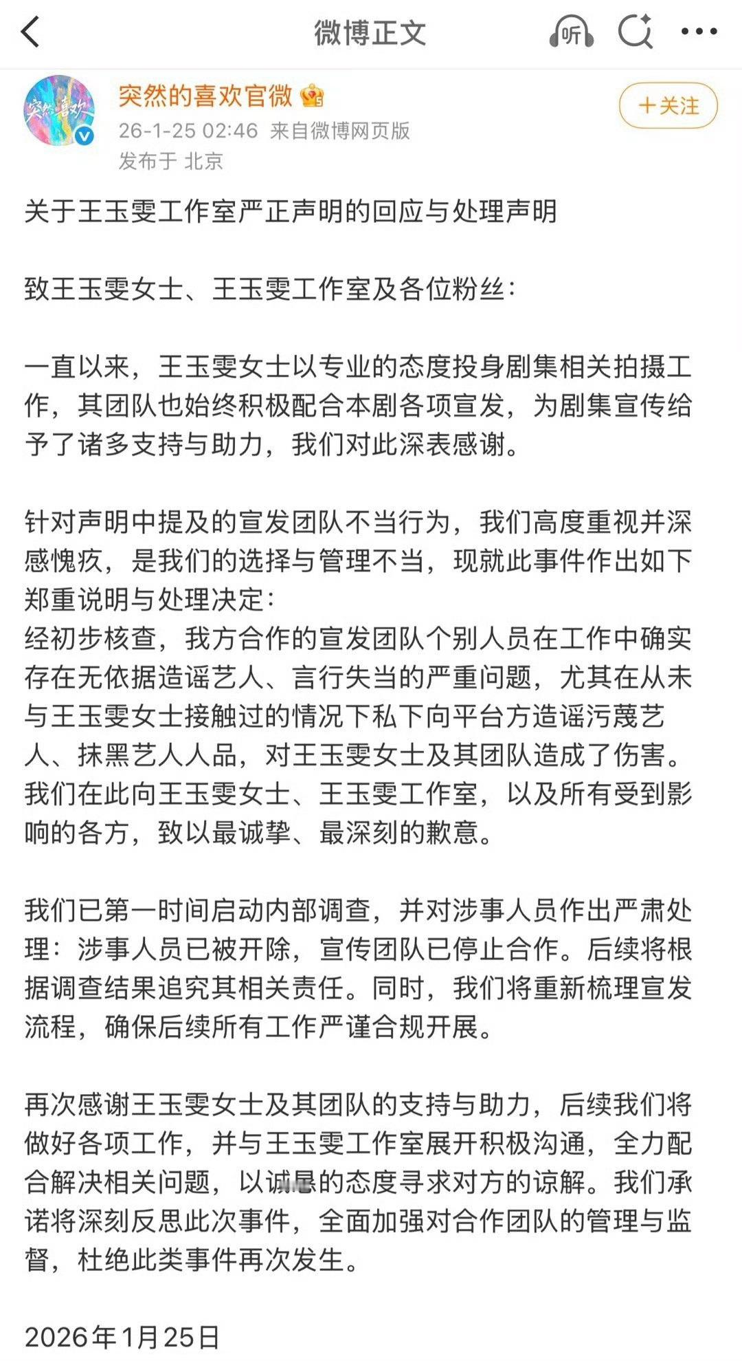 王玉雯方严正声明王玉雯方宣布停止一切剧宣工作1月25日,就参演剧集合作宣发团队