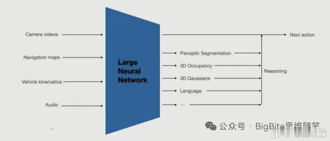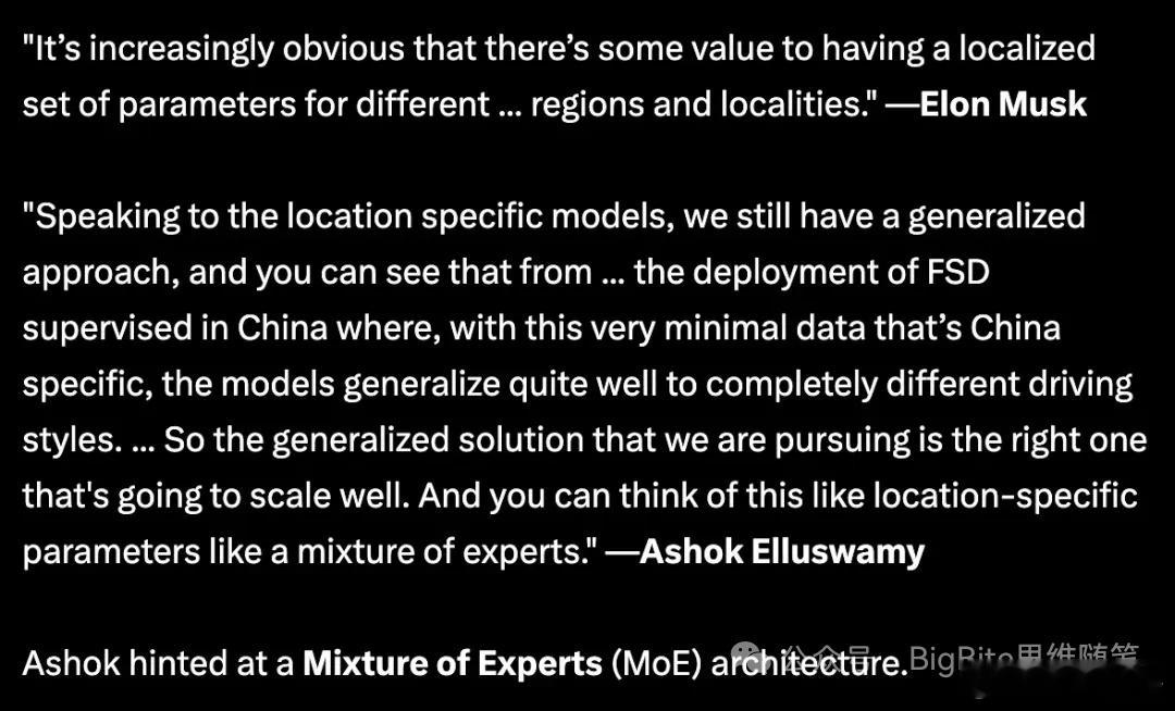 为什么说Tesla FSD就是一个端到端大模型【BigBite思维随笔】郎博点赞 最近几天有人根据快一年前(2025年4月)著名Tesla黑客green爆料的Tesla FSD芯片上有上百个神经网络文件的信息,断言Tesla FSD其实是数百个小场景组合,然后还说马斯克的特长是把“落后”的东西组合起来形成非常好的工程化效果,原链接贴在这了。本来我对此感觉比较搞笑,没想到一早上起来好几个朋友问我意见,索性就把我回答他们的内容稍微整理下发出来。先说结论:Tesla FSD就是一个大模型,这点Ashok在今年ICCV上已经给过一个端到端模型的简单示意图,确认了Tesla端到端自动驾驶使用的是一个巨大的神经网络来完成Photon In到Control Out的计算。ICCV Ashok分享的TeslaFSD是一个大模型的架构质疑FSD不是一个大型网络的主要观点在于green发现FSD有数百个神经网络参数相关的文件,并且其总规模相当大,HW3上的v12.6上A核1.2GB,B核2.3GB,HW4上的v13则达到A核2.3GB,B核7.5GB,其中A核包含189个参数文件,B核110个,其中61个共享。green发现的FSD模型参数文件信息这里可以发现B核神经网络参数远多于A核,同时A,B共用的只有61个参数文件,也就是说早年AI Day上分享的A,B核互成冗余的设计实际上在Tesla V12端到端化之后神经网络规模急速膨胀之后已经很难实现完全的A,B核冗余(其实传说中V11阶段就很难实现完全的冗余备份了)。而B核参数文件数量虽少,总文件大小却更大,其实原因在于后期端到端的模型规模远超从前,而这部分模型参数主要集中在B核。也就是说在green挖掘出来的模型参数文件中,有数量众多但规模不大的参数文件可能不属于端到端网络。这比较合情合理,因为Tesla是一个不使用雨量传感器的公司,其自动雨刷甚至都是有一个饱受诟病的视觉神经网络控制,再加上大量进行数据采集trigger相关的小的感知任务依旧大部分从V11以前继承下来,因此这里边大量的模型参数文件其实是一些小的任务Head的模型参数。另外green的发现其实提到这里边很多模型参数其实是一个大模型的部分参数,有着FSD_E2E_FACTORY_PART_X这样的命名规则。AI Day上Tesla曾介绍其模型是通过分布式部署的,因此将模型参数分片存储或者进行切分存储在不同芯片上实际上是大模型时代里比较常见的现象。而让人们怀疑Tesla并非是一个大模型的更重要的原因来自于Tesla有限的显存带宽很难支持使用规模巨大的端到端模型并保持其号称的36Hz高频Control输出。确实HW3使用的LPDDR4-4266带宽只有68GB/s,要支持36Hz输出,模型参数规模理论上不超过1.8GB,Tesla HW3仅对INT8支持良好,因此这也就是说FSD 12稠密计算的理论上限大概就是18亿参数,而考虑到理论实际的差异,这个数字更难达到。刚才说过,green发现HW3上承载大部分端到端参数的NodeB上参数文件大小2.3GB,大致上与此匹配。而HW4上Tesla使用了成本高昂的GDDR6显存,显存带宽高达384GB/s,有消息称HW4上Tesla使用FP8的参数类型,而这样的模型理论上可以在36Hz支持约100亿参数的端到端模型。参考HW3与HW4 NodeB的参数文件大小,基本上与Tesla FSD Release Note之前说的参数量增加3.5倍左右可以对应起来,因此我认为这个3.5倍模型参数增长我认为是可信的。而Elon曾说后续还会以10倍的增量提升FSD参数,这个被很多人质疑,原因就是目前看来无论HW3还是HW4上,显存带宽留给参数scaling的空间已经不足了。关于这个问题其实在财报会议上Elon和Ashok都给出了比较明确的回答,之所以Tesla在19年的HW3和23年的HW4这样相对比较老的芯片上能够以非常高的频率运行令行业比较震惊的端到端大模型规模(某国内头部端到端方案传闻0.7B模型参数量),其原因就在于Tesla使用了类似MOE的架构。通过MOE架构,FSD可以在显存容量可以容纳的基础上,通过部分激活专家网络,节省显存带宽开销,最大程度提升模型等效参数量。考虑到HW4上16G显存容量以及可能的模型并行部署策略,HW4上FSD V14模型参数再大幅增加,我觉得也不是不可能。并且通过Elon的评论我们还知道,Tesla可能确实会在某些场景,如厂区自动出场使用一些Localized参数,我的理解这些是通过类似MOE的方式增加的额外专家参数,各种场景主要参数都是公用,这也符合无论什么场景,大部分驾驶是有共同性的这样一个第一性基本原理。而那种原文所谓的根据人工设计的规则完全切换一套独立的小模型的方式不仅不端到端,甚至实际很难实现,因为在场景切换的过程中很难保证前后模型输出的轨迹可以平滑连接,必然会造成很不舒适甚至危险的情况。Elon和Ashok对于FSD使用MOE架构的评论总而言之,Tesla FSD是一个端到端的大模型方案。根据ICCV上的分享,其端到端的程度甚至可能超出此前的普遍估计。至于说FSD其实是落后的技术方案更是无稽之谈,作者感觉对技术先进性有一定的误区,不是只有科学家的发现才代表先进性,许多人类伟大科技进步都是技术进步。就好像可回收火箭是先进的科技进步,利用猛禽发动机组合阵列的方式获得巨大推力推动星舰也是先进的科技进步,火箭相关研发人员经常被称作火箭科学家,但是火箭技术成熟落地依靠的其实更多是工程创新。另外马斯克是美国工程院院士。如果这样人以及Tesla,SpaceX这样的公司都是落后的,伪装的科技公司,那么请告诉我哪家是先进的科技公司。