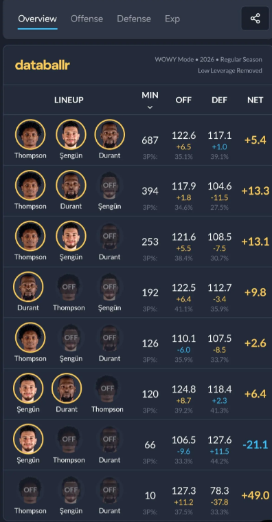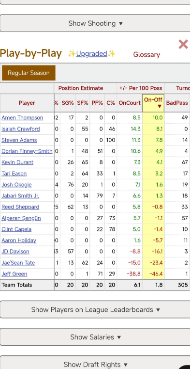 申京在没有阿门和杜兰特,单独带队的时候效率值-21,说明他也没带队能力。 他不是和谁搭,和谁不搭的问题,他是实力不够,显得他和谁都不适配,on-off他也是负的,这赛季除了bpm其他高阶都不咋样了,凭一己之力让bpm可信度暴跌。
